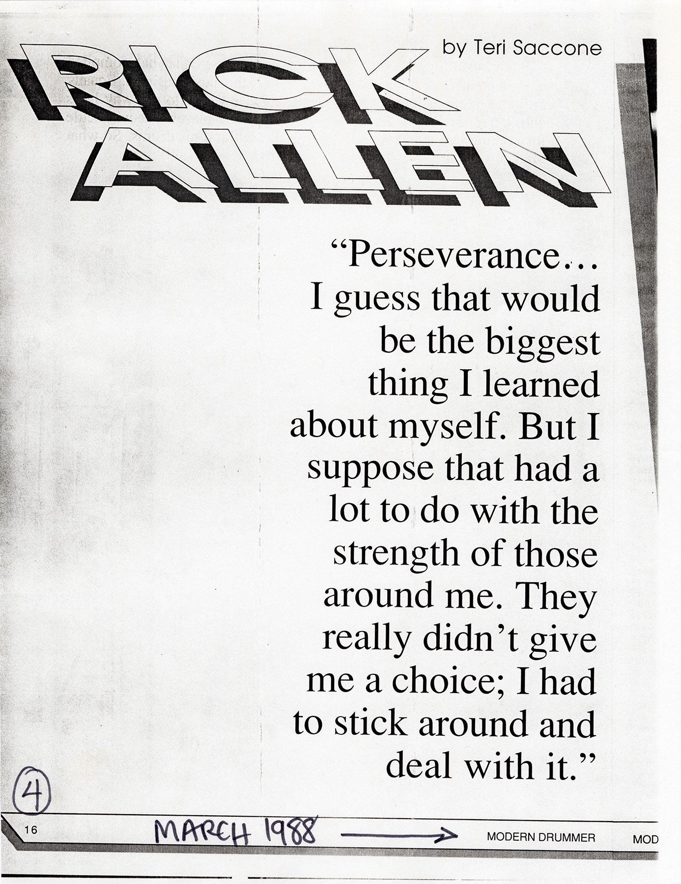 Photocopy of the first page of a Modern Drummer feature on Rick by Teri Saccone, March 1988. From the Collection of Def Leppard.