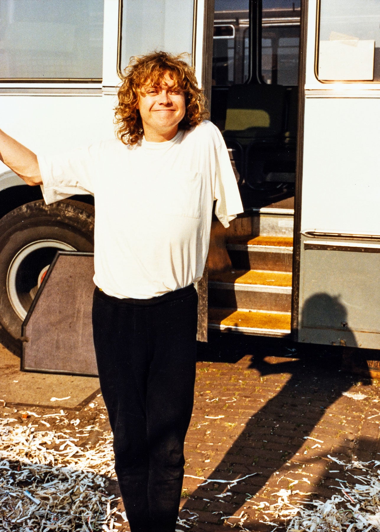 Rick stands outside a production trailer on the "Women" music video set, Amsterdam, Holland, May 1987. From the Collection of Joe Elliott.