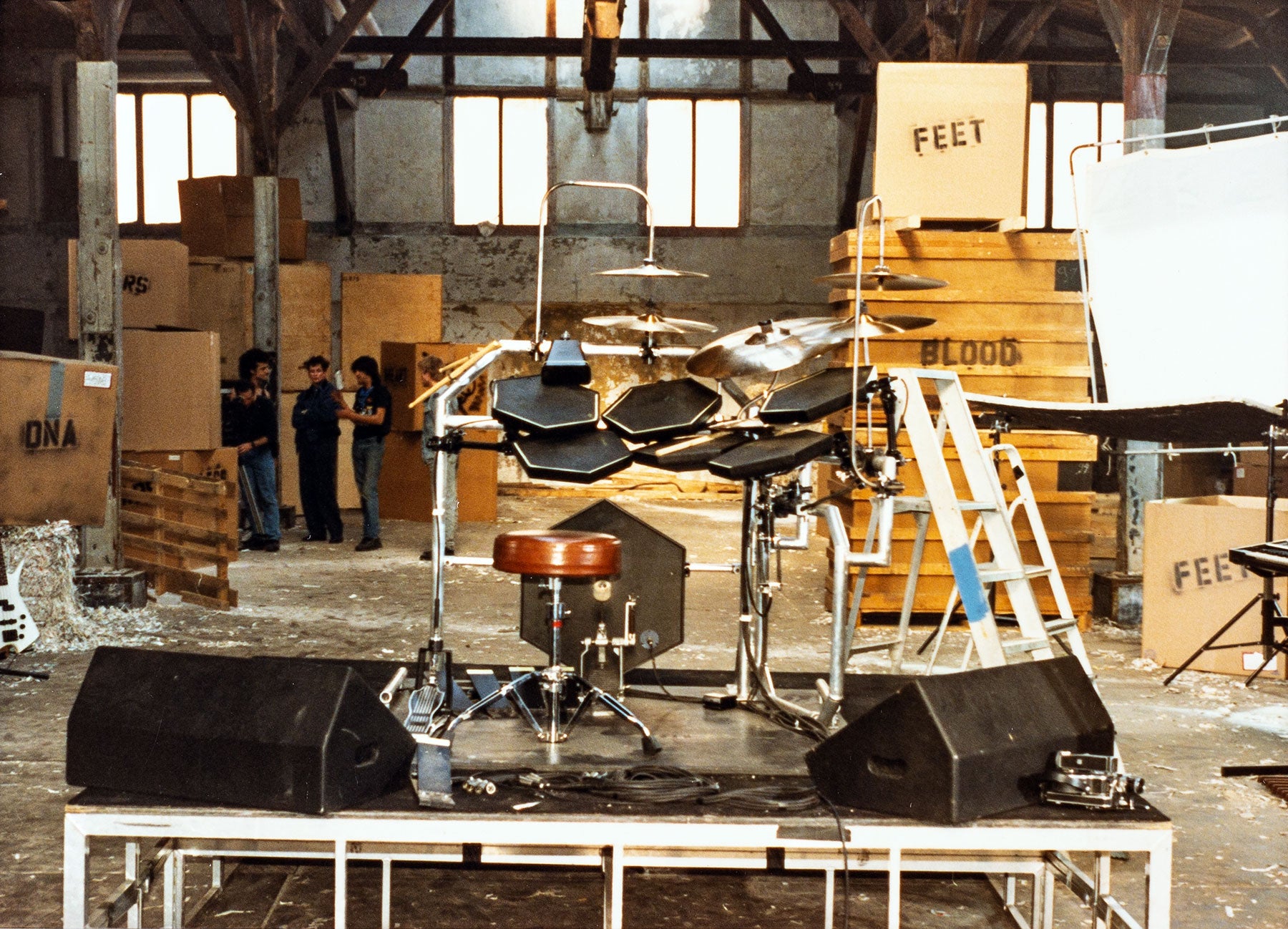 Rick's kit is set up on a small platform in a warehouse in Amsterdam, Holland, in preparation for the "Women" video shoot, May 1987. From the Collection of Joe Elliot.