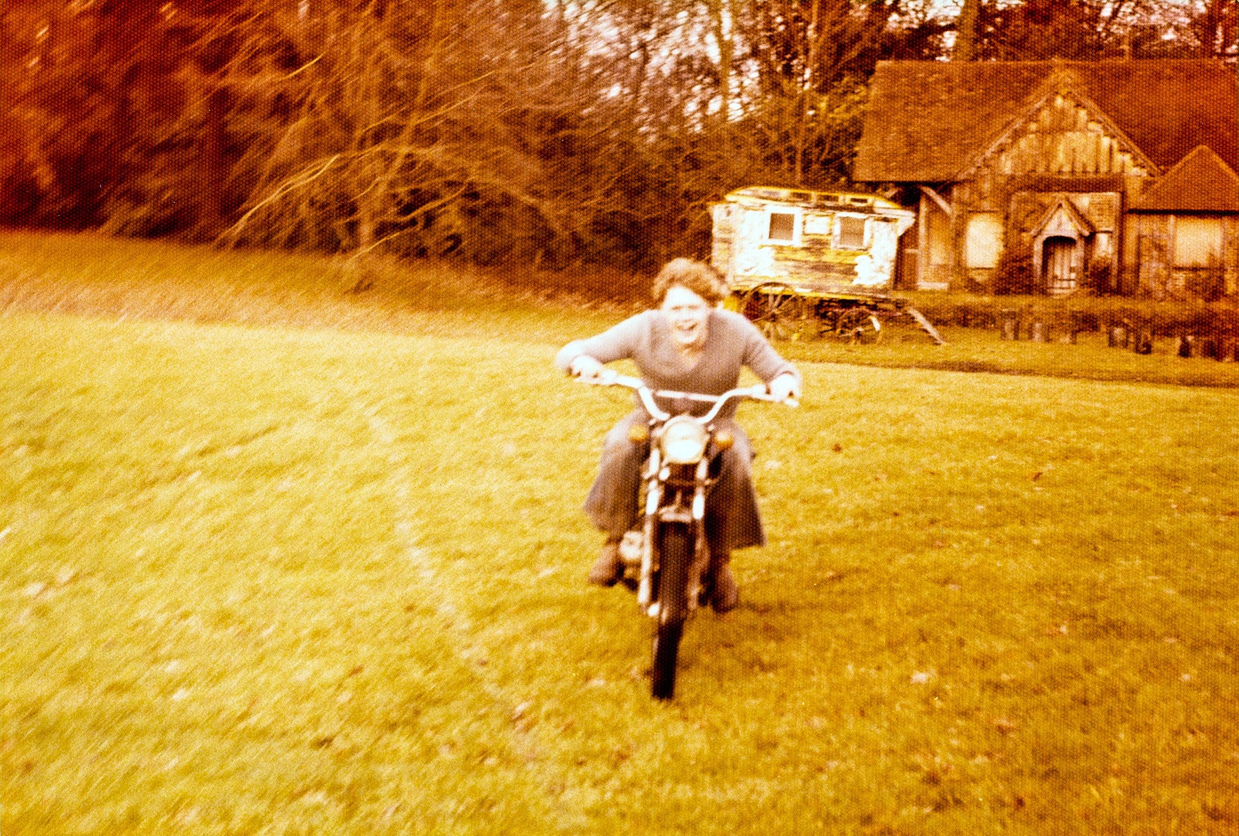 Rick enjoys a motorbike ride in-between takes recording On Through The Night at Tittenhurst Park, London, December 1979.