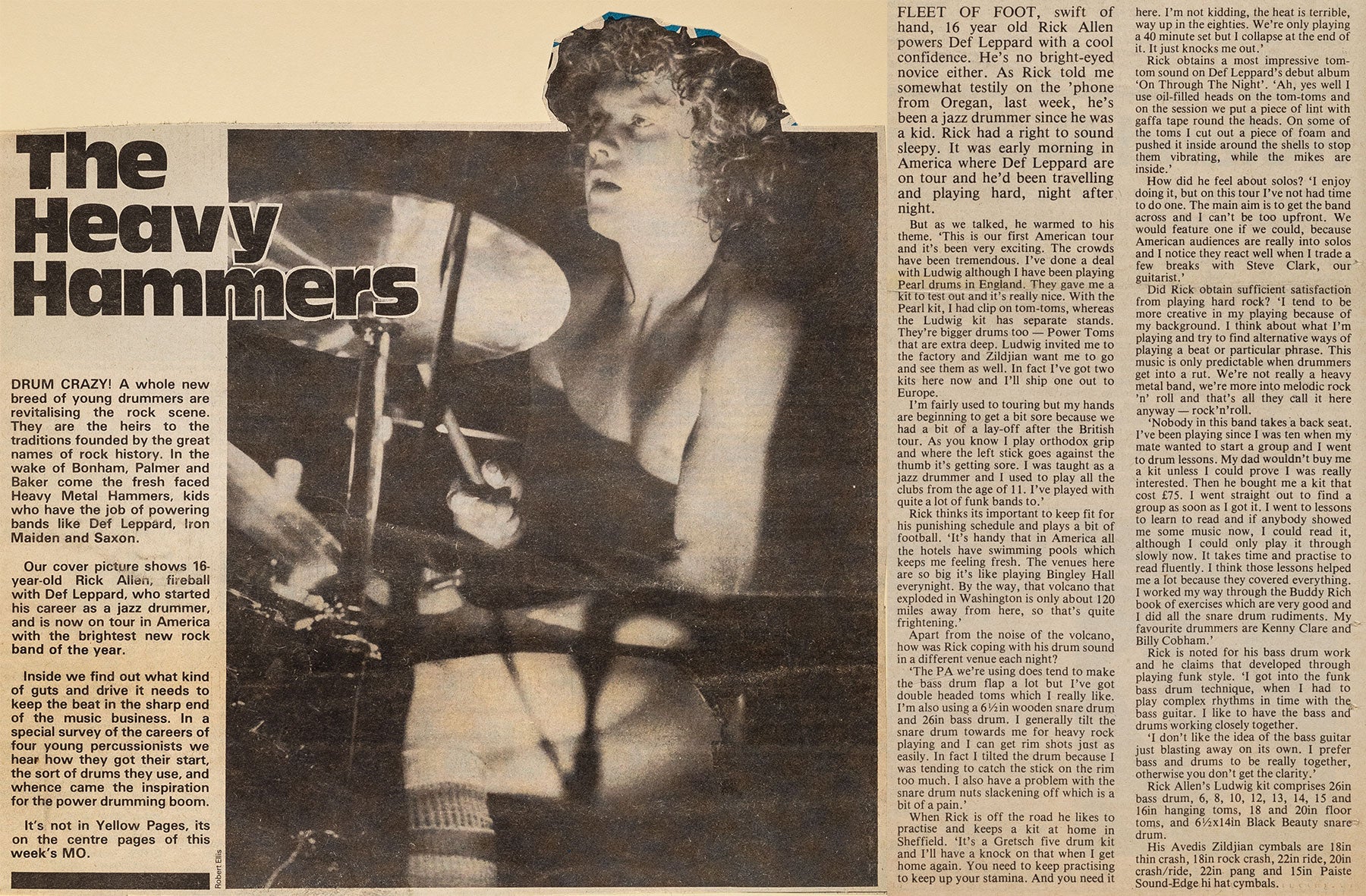 Clipping from a 1980 article in Sounds featuring Rick as one of "The Heavy Hammers" of rock. The article focuses on Rick's gear and drumming style, but also covers the band's first trip to America, his "impressive" On Through The Night sound, and the Mount St. Helens eruption which occurred about 120 miles from where the band was playing. From the Collection of Joe Elliott.
