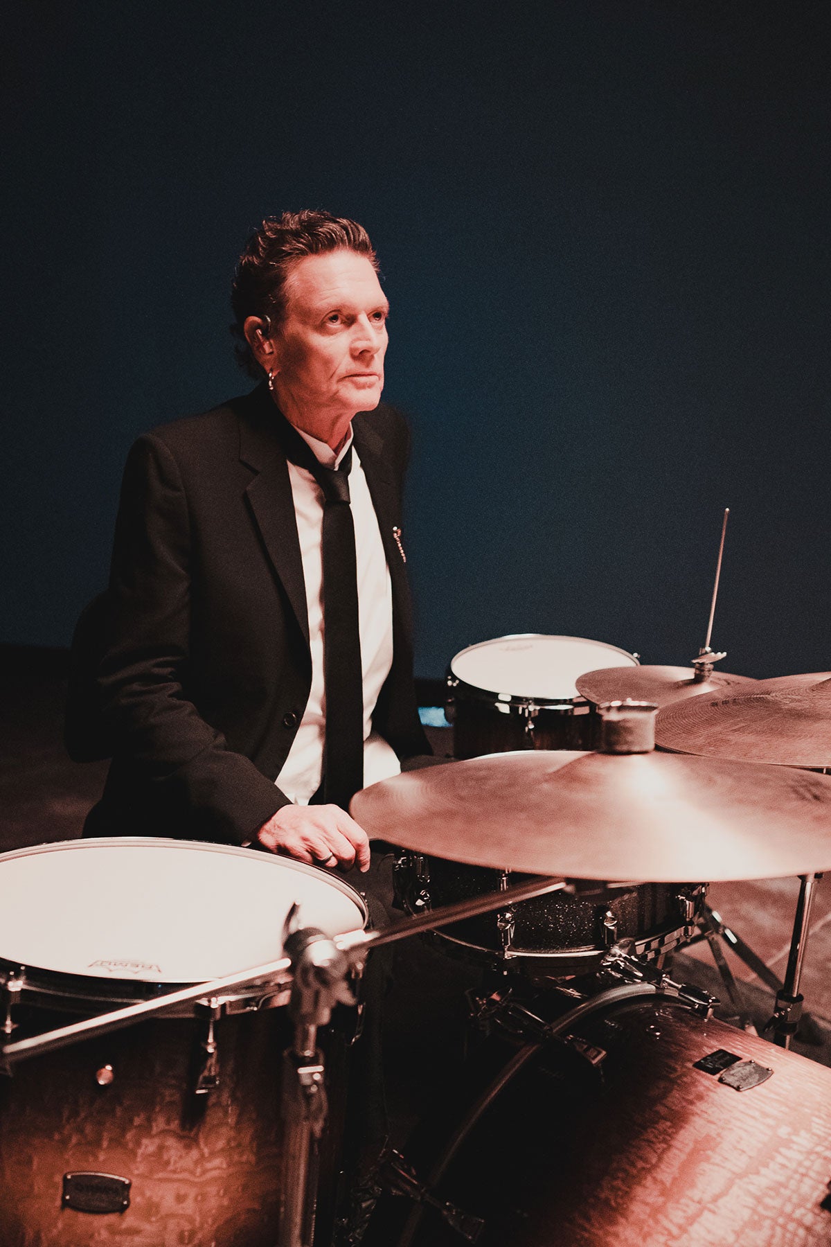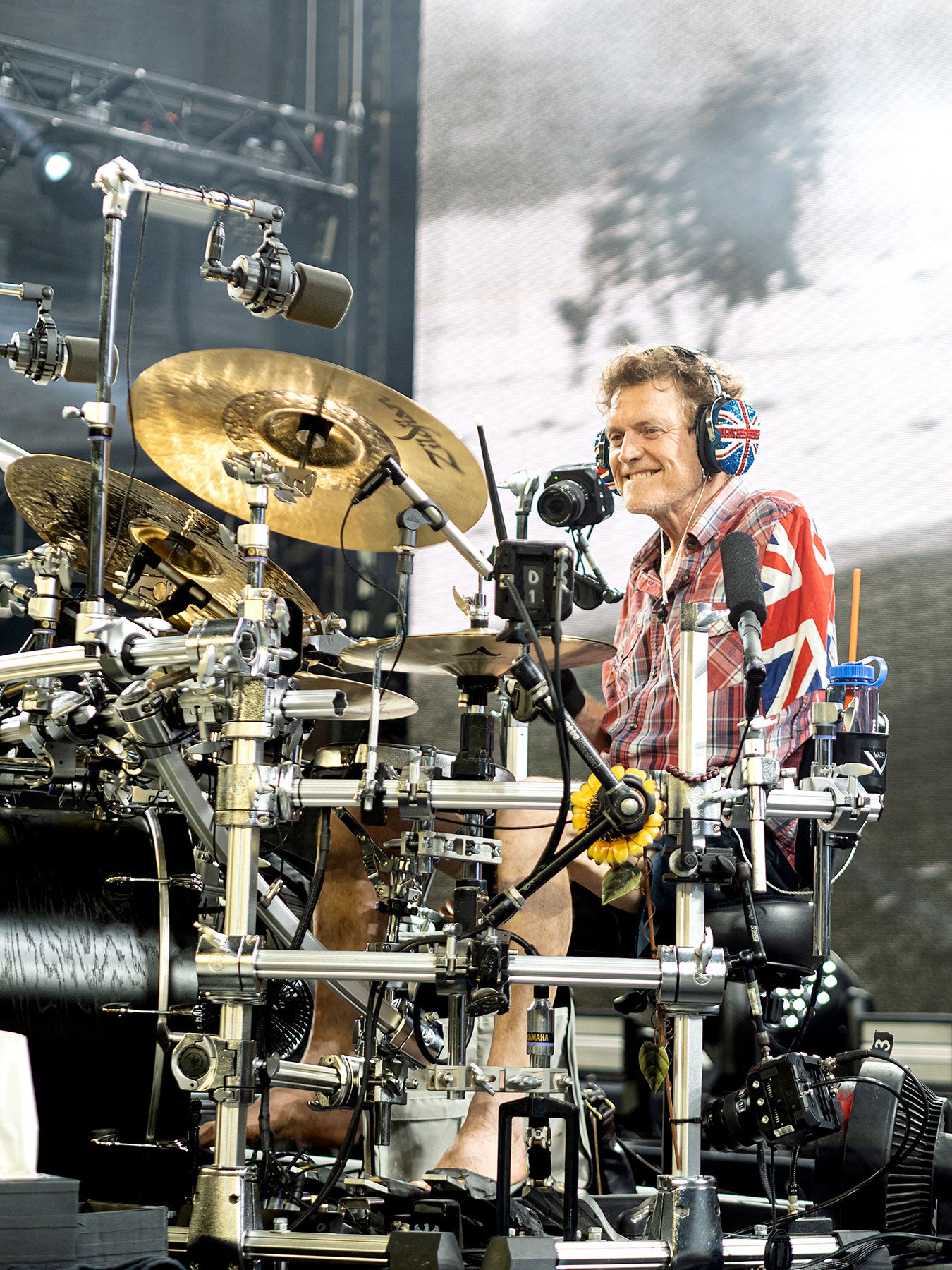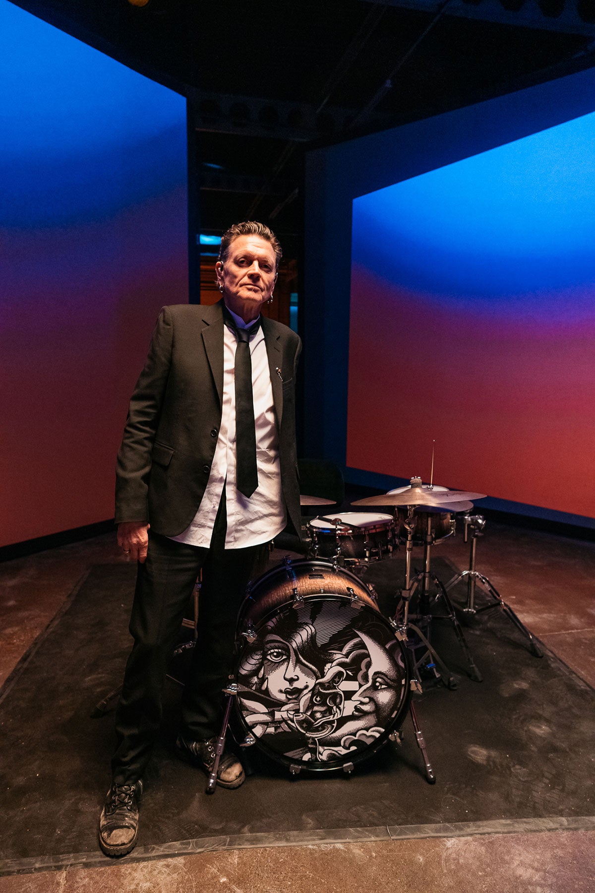 Rick gets ready to bring the big beat back on the "Fire It Up" video set, London, England, February 2022. Photo: Ryan Sebastyan. From the Collection of Def Leppard.