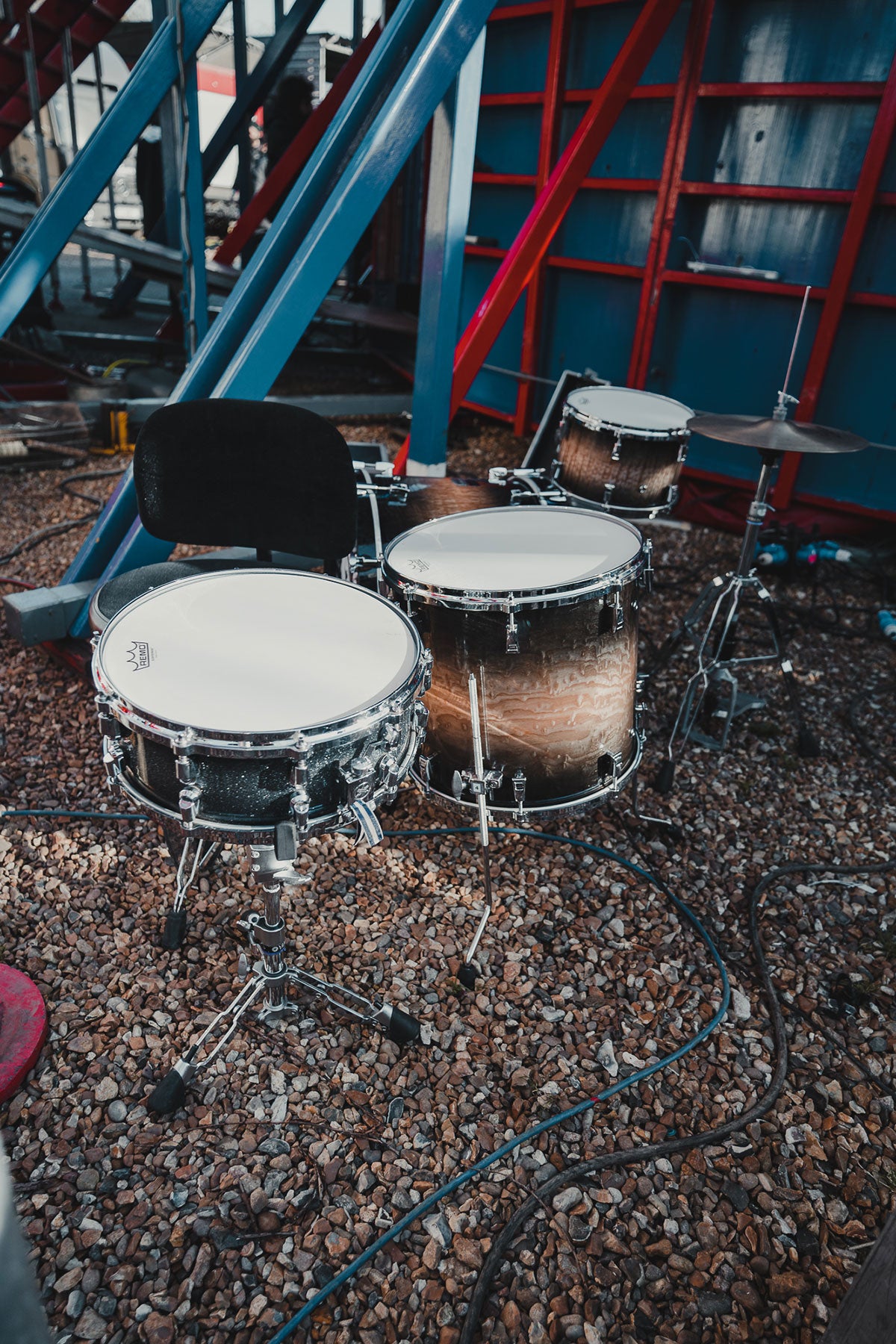 A few of Rick's drums sit at the ready for the "Kick" video shoot in a cold field just north of Cambridge, England, 8 February 2022. Photo: Ryan Sebastyan. From the Collection of Def Leppard.