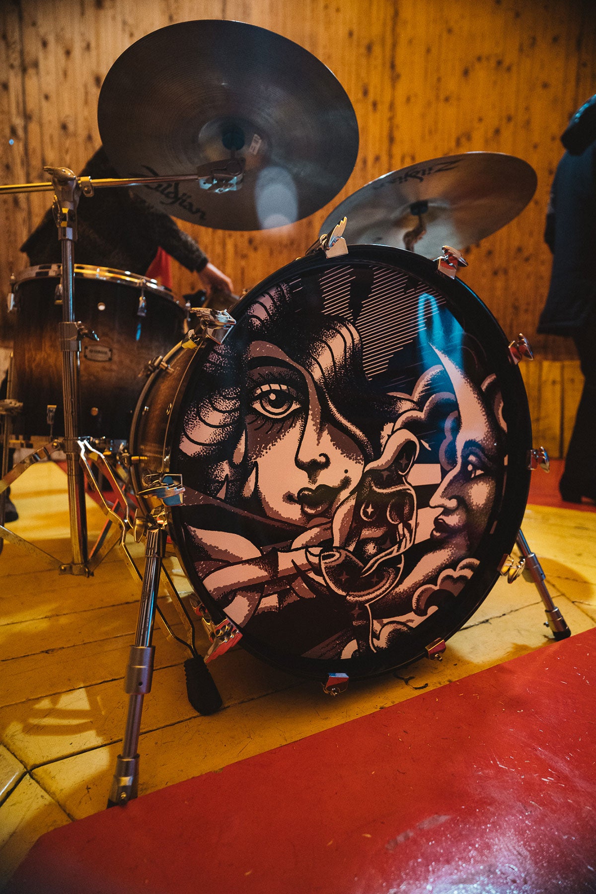 Rick's drum kit waits inside the "Wall of Death", a wooden cylinder that houses a vintage-style motorcycle thrill show, for the "Kick" video shoot, Cambridge, England, 8 February 2022. Photo: Ryan Sebastyan. From the Collection of Def Leppard.