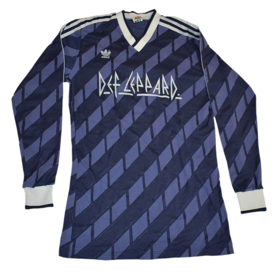 Based on Sav's favorite football team, the Sheffield Wednesdays. This collared blue and white striped shirt with red accents reads "Def Leppard Hysteria Tour 1987" on the right breast, and clearly reflects the band's love of soccer. Umbro logo in red on the left breast. We're team Leppard all the way. From the collection of Def Leppard.
