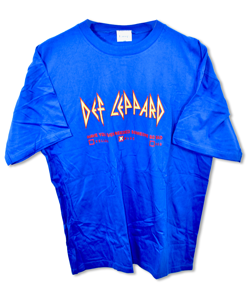 The blue version of a series of three colorful shirts marking the release of "Have You Ever Needed Someone So Bad" from Adrenalize, 1992. The dreamy rock ballad sold more physical copies in the States than any other Def Leppard single, and so needed more than one color shirt to celebrate. From the collection of Def Leppard.