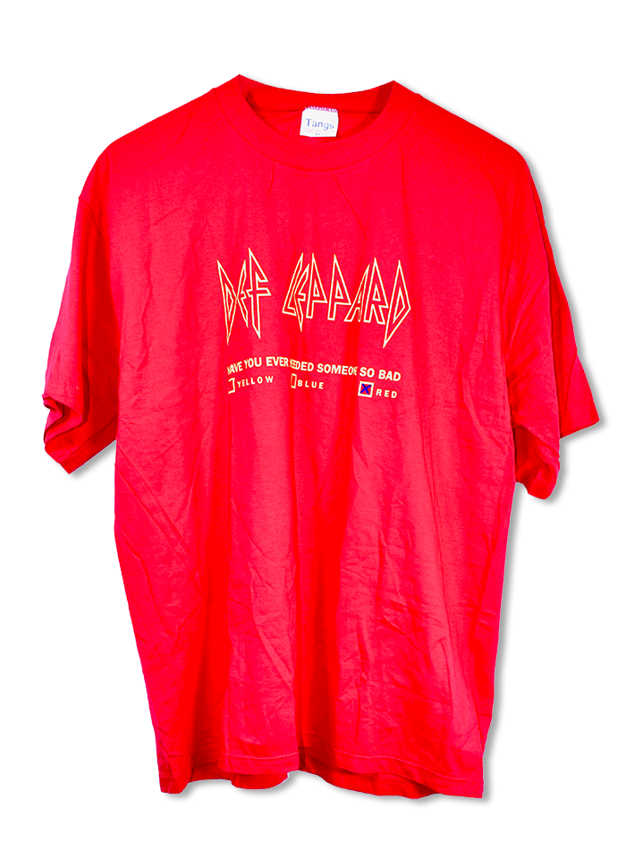 The red version of a series of three colorful shirts marking the release of "Have You Ever Needed Someone So Bad" from Adrenalize, 1992. The dreamy rock ballad sold more physical copies in the States than any other Def Leppard single, and so needed more than one color shirt to celebrate. From the collection of Def Leppard.