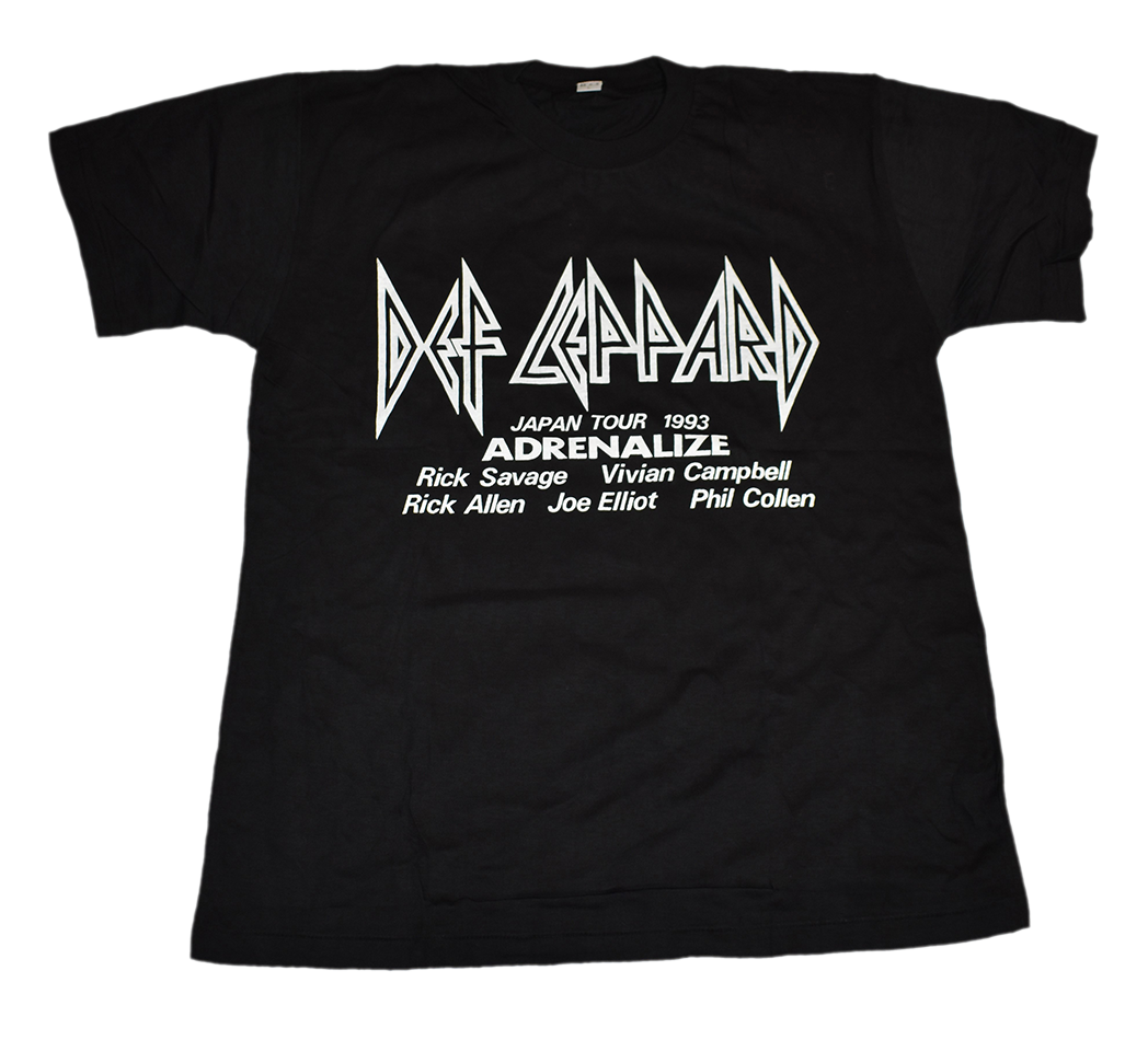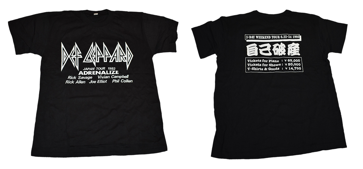 Back to basics with this plain black tee featuring a white Def Leppard logo. "Japan Tour 1993," "Adrenalize," and the names of the band members are printed on the front. The back features incorrect dates for the final weekend of the Adrenalize Tour Japan. The shirt reads "6.22-24" along with a menu of prices for plane tickets, concert admission, and a swag allowance. But this final Japanese weekend ran at the Nippon Budokan 21st June through 23rd June, 1993. A rare misprint! From the collection of Def Leppard.