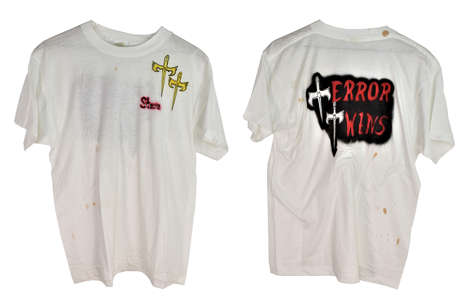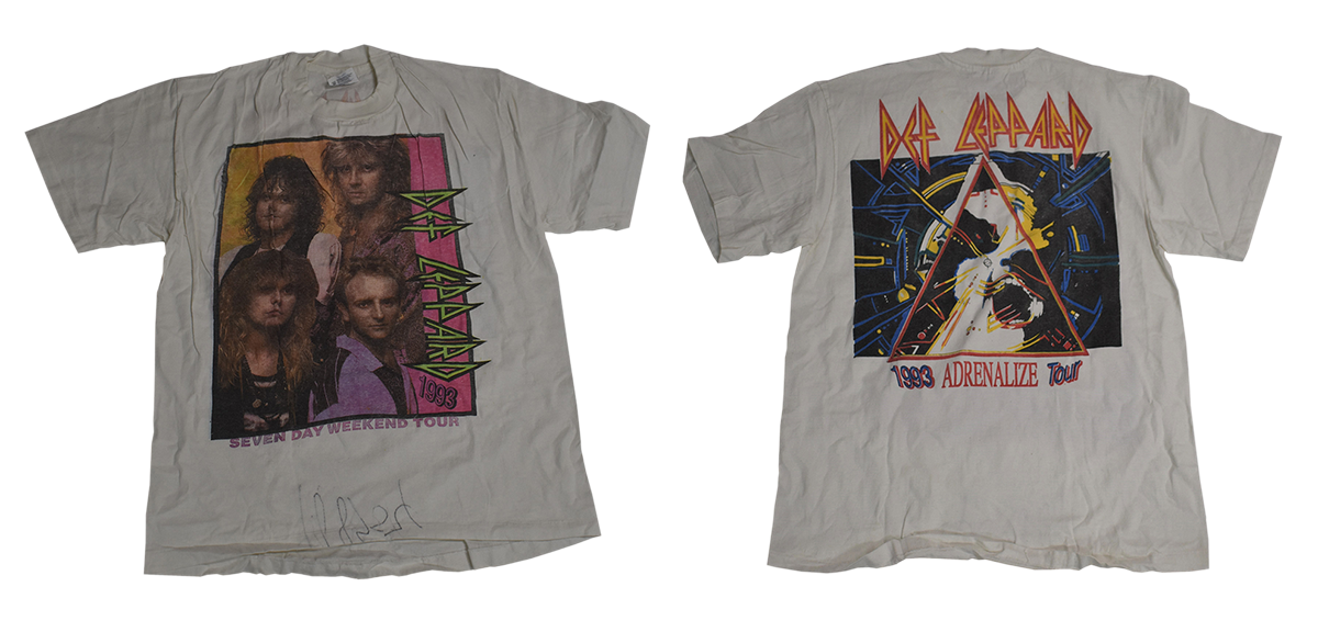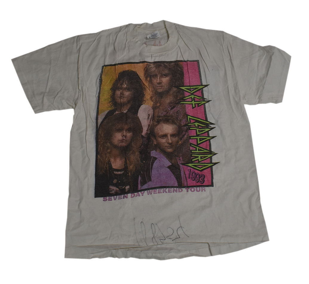 A fan-painted t-shirt tribute to the "Terror Twins." This tee was Steve's, and he was always touched and grateful for fan artwork. Of course Phil and Steve's "Terror Twins" moniker reflected their dual guitar attack on Pyromania and Hysteria, as well as their friendly off-stage antics. Collen and Clark were the very best of mates, and friendships of that depth are a blessing forever. Bonus: a close examination reveals splatter stains on the front and back of the shirt, which look very much like blood. Or coffee. You'll have to make up your own story to match this mystery. Courtesy of the Lorelei Shellist Private Collection.