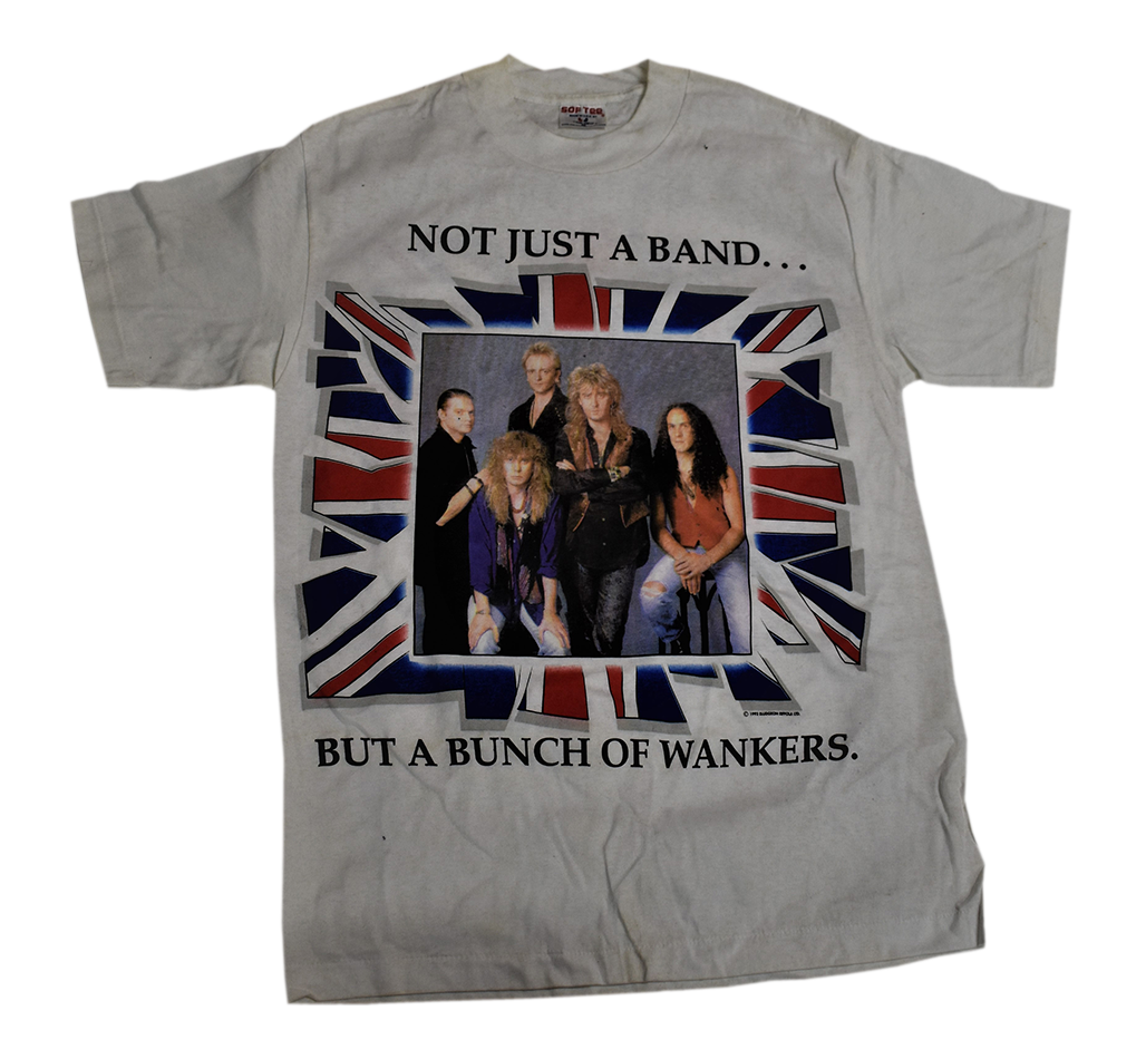 We only hurt the ones we love. This shirt was created as an inside joke between the band and their team coined by the crew. This tough love tee features a full color picture of Rick Allen, Phil Collen, Joe Elliott, Vivian Campbell, and Rick Savage, and "Not Just a Band...But a Bunch of Wankers" proudly printed on the front, over a shattered Union Jack. On the back, we have the Adrenalize logo over the same broken Jack, with the words, "We Suck, Zen is Optional." From the collection of Def Leppard.