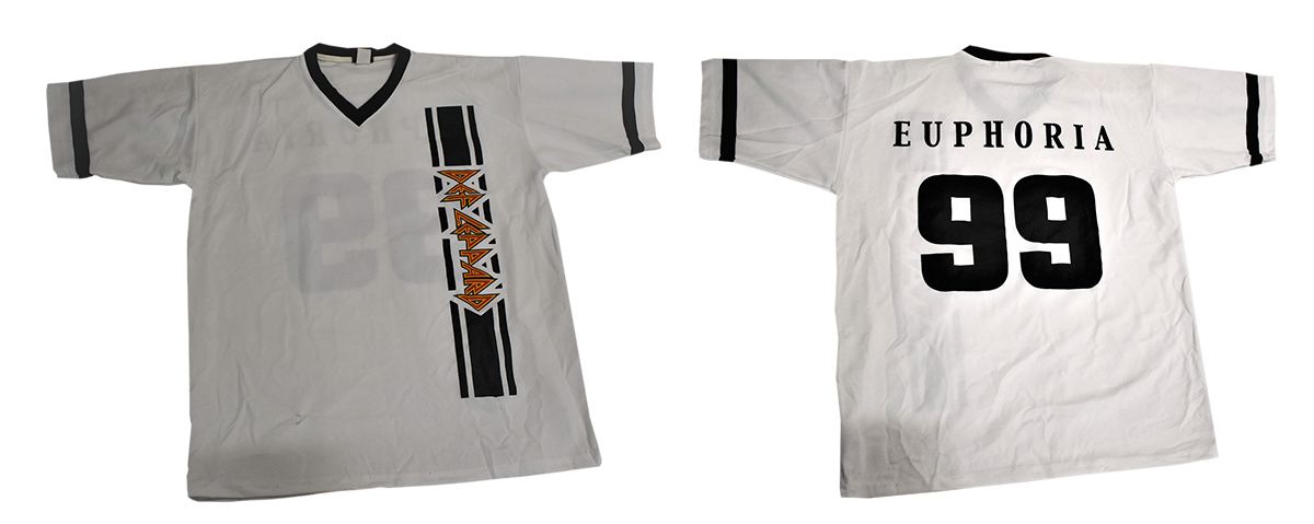 White short-sleeved v-neck sport jersey with red Def Leppard logo on a black stripe down the front, and Euphoria 99 printed on the back. Euphoria was the 7th studio release from the band, and featured the number one hit "Promises." From the collection of Def Leppard.
