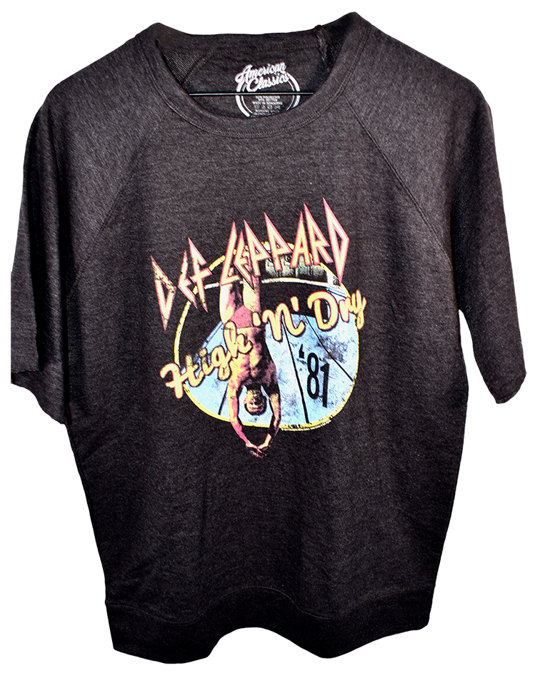 A tribute to the mighty High 'n' Dry album of 1981. This dark gray, loose fitting crew neck t-shirt sports a classic red and yellow Def Leppard logo and High 'n' Dry artwork. From the collection of Def Leppard.