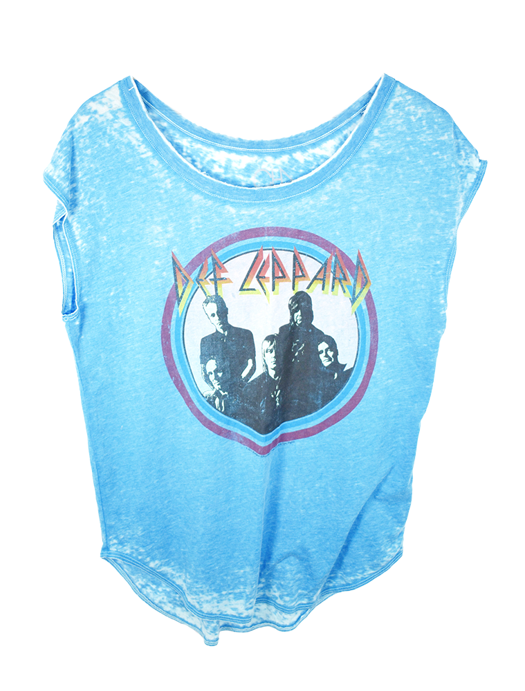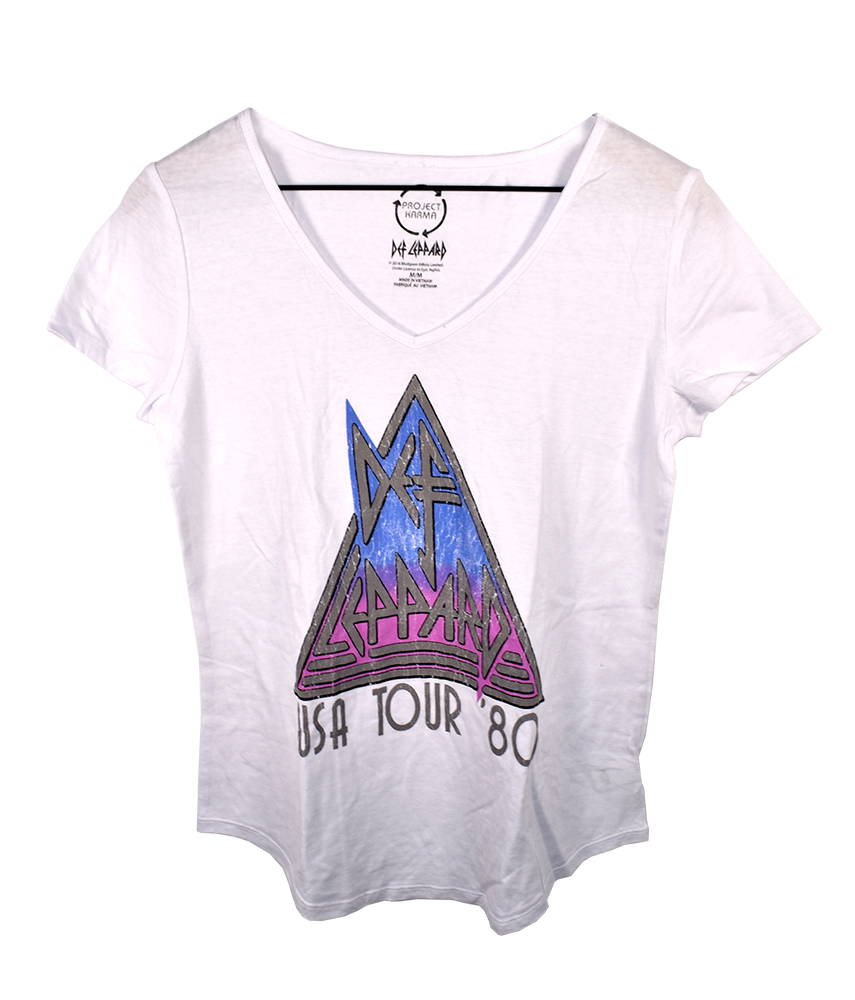 A tribute tee to the awesome original 1980 On Through the Night Tour, USA leg. White sheer v-neck with short sleeves and blue and pink logo treatment. From the collection of Def Leppard.