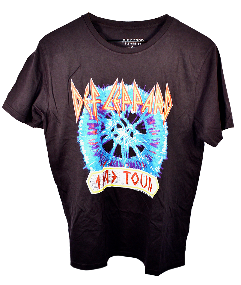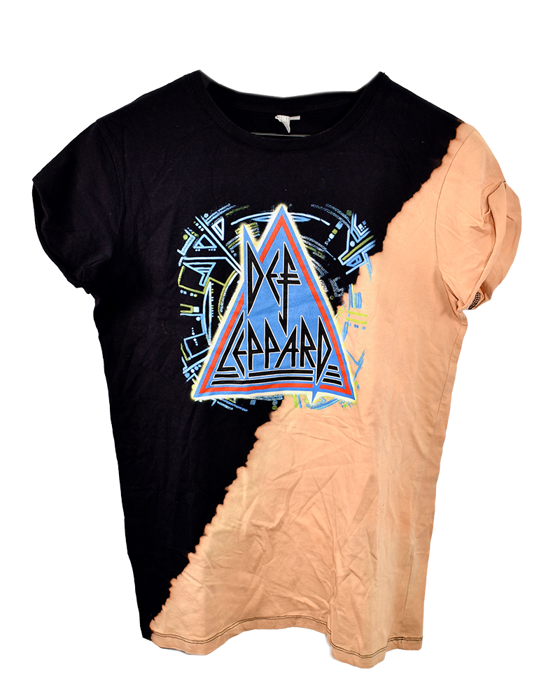 Awesome half black, half bleached out tan short-sleeved t-shirt featuring the Def Leppard logo over Hysteria art. From the collection of Def Leppard.