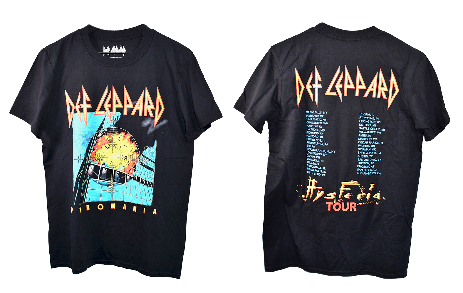 Much like the finest mullet, this t-shirt mixes it up with a little Pyromania in the front, and Hysteria in the back. A black short-sleeved t-shirt that features Pyromania album cover artwork across the chest, with Hysteria Tour stops from Glens Falls through Los Angeles printed on the back. From the collection of Def Leppard.