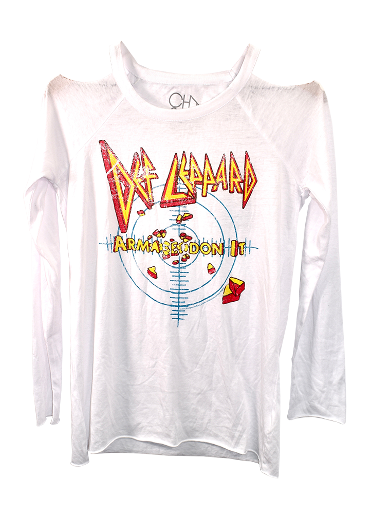 Awesome lightweight long-sleeved baseball-style Def Leppard t-shirt with open shoulders, and the Armageddon It single artwork across the chest. From the collection of Def Leppard.
