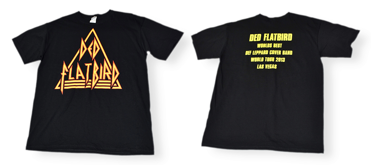 This pristine shirt for Ded Flatbird fits into Def Leppard music history as the “World's Best Def Leppard Cover Band, World Tour 2013 Las Vegas”. From the collection of Def Leppard.