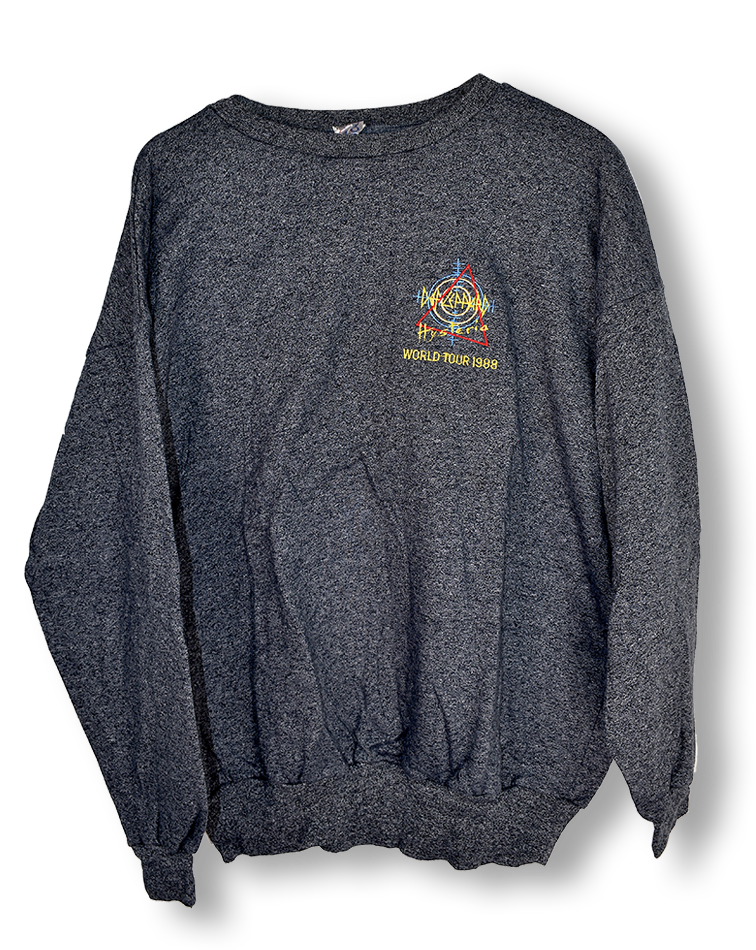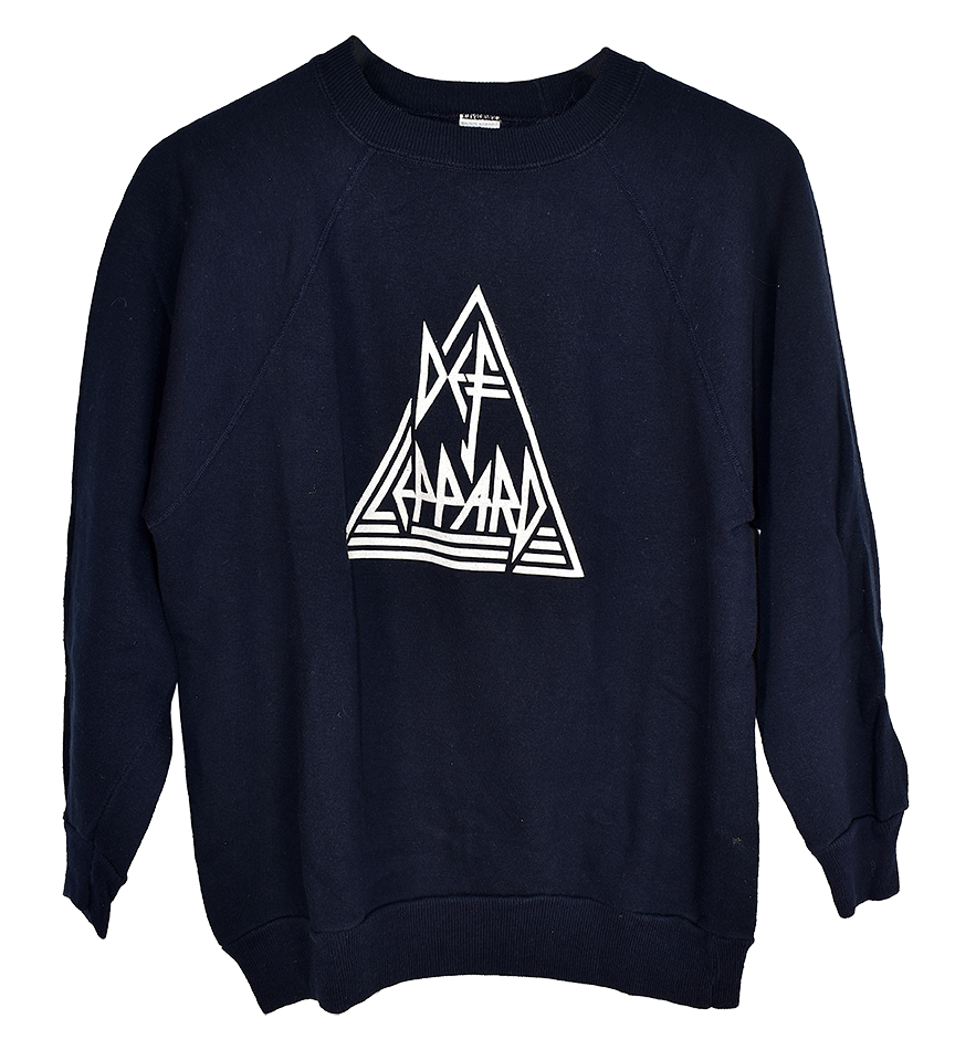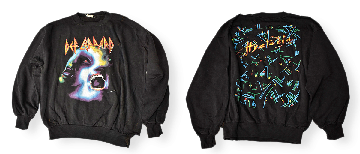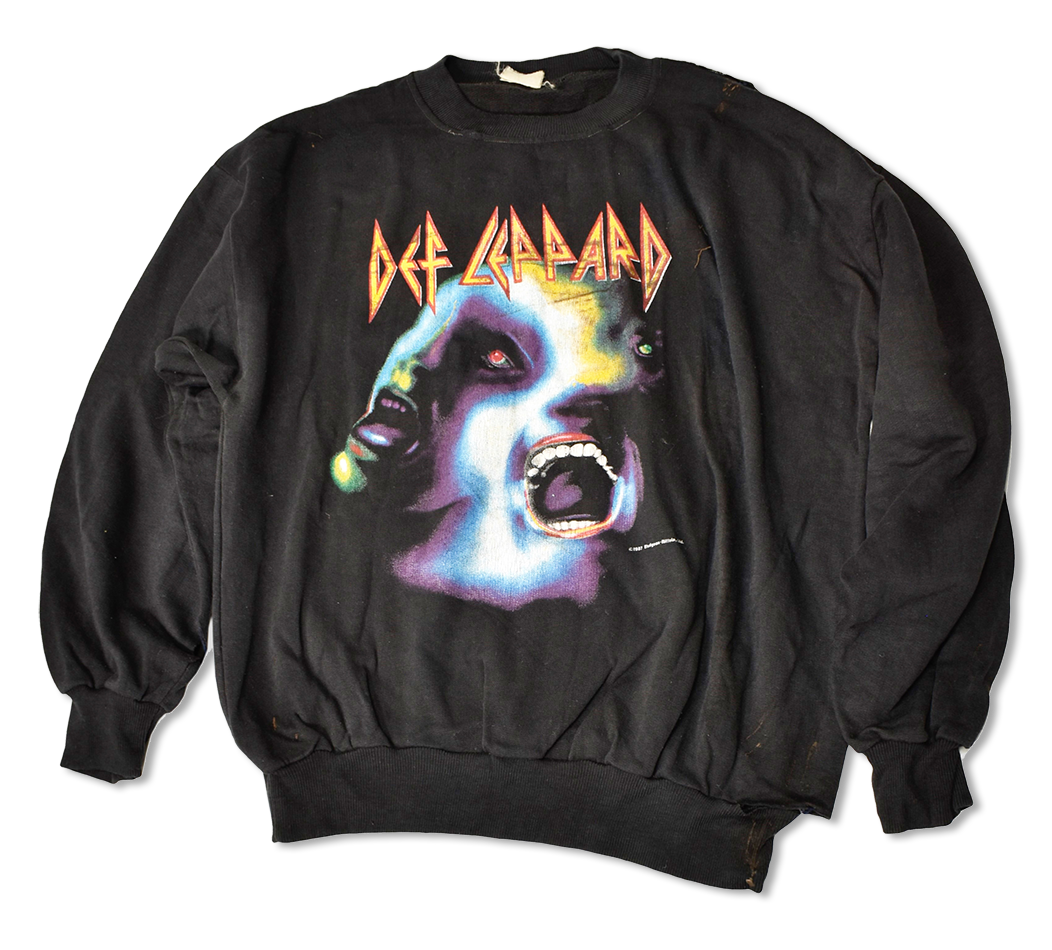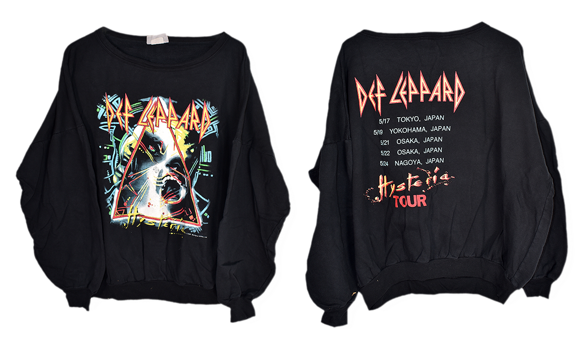 Steve Clark's original black sweatshirt by Brockum from the Japan Hysteria Tour, May 1988. The band was blown away by the kindness and enthusiasm of their Japanese fans, many of whom made personalized gifts for them. The Japan Tour kicked off in Tokyo Tuesday, 17th May 1988 at the Yoyogi National Gymnasium. Courtesy of the Lorelei Shellist Private Collection.