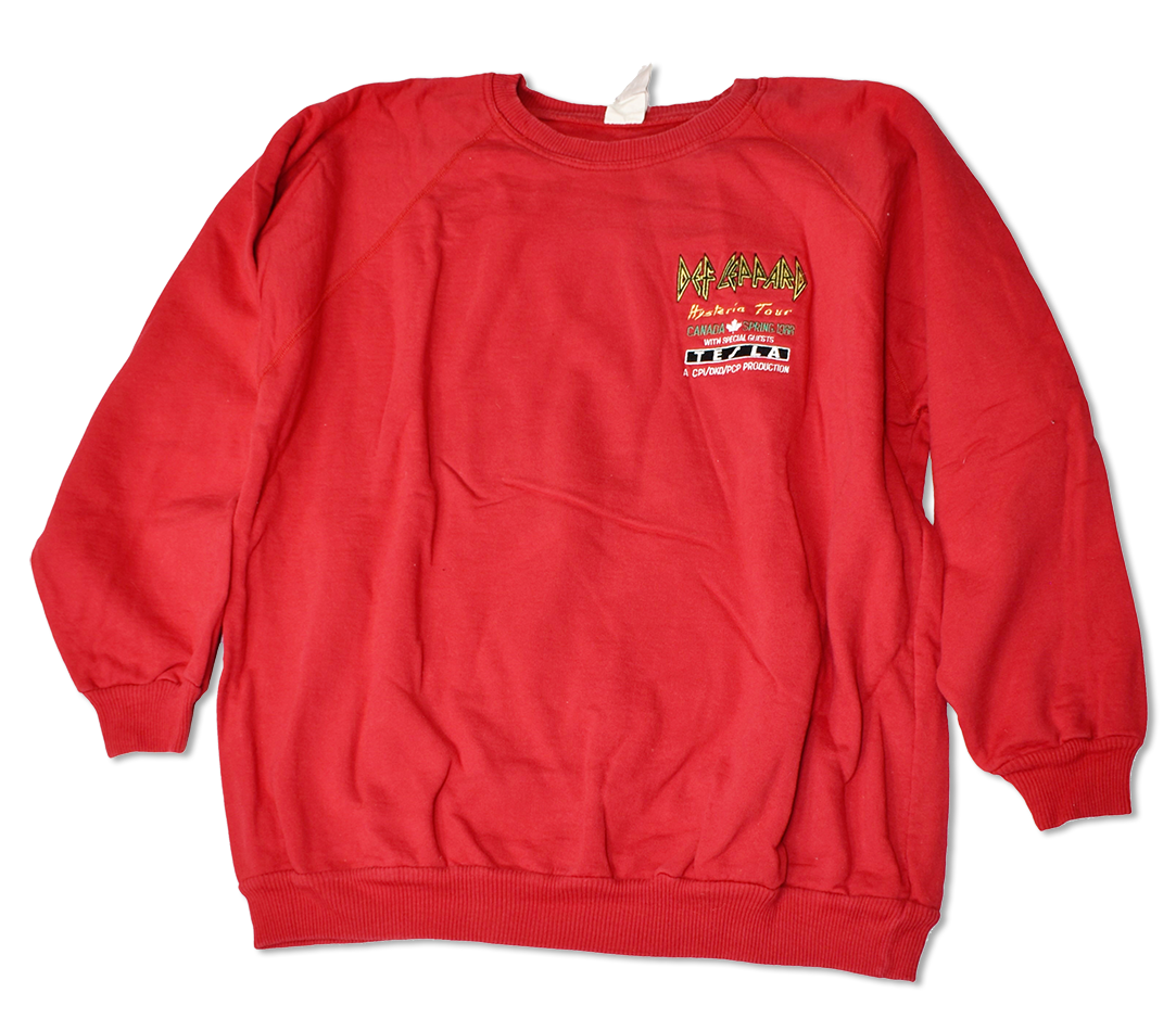 Super rare red Def Leppard Hysteria Tour sweatshirt given to them by promoter with classic Def Leppard logo embroidered on the front. Underneath reads "Hysteria Tour", "Canada Spring 1988", "With Special Guests Tesla". A perfect Brockum memento from an unforgettable tour. From the collection of Def Leppard.