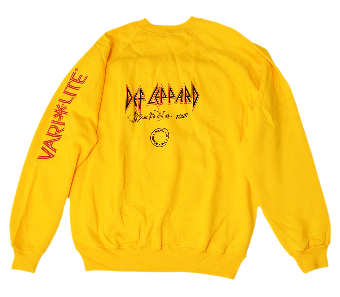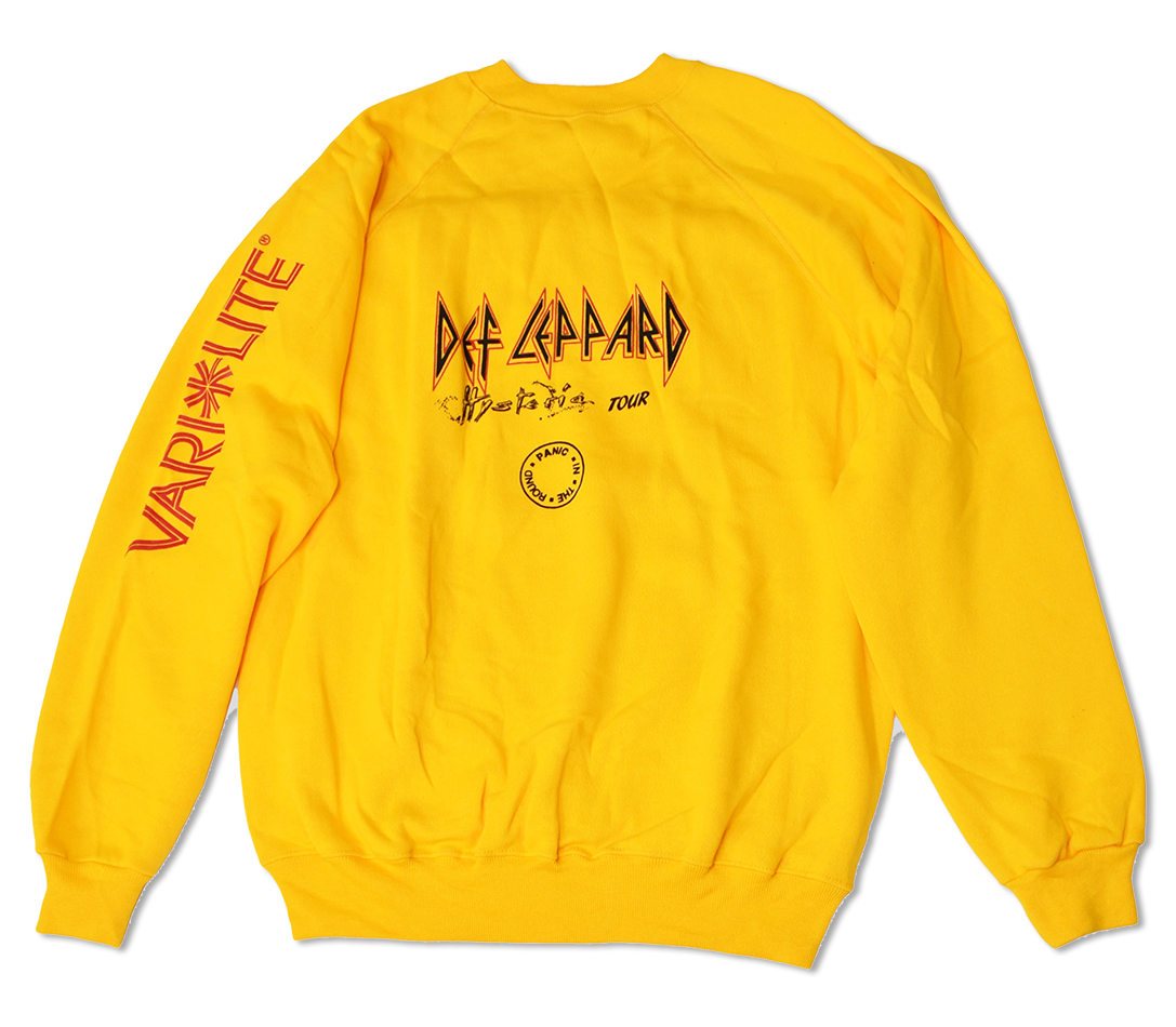 Yellow sweatshirt with black "Def Leppard Hysteria tour panic in the round" on front. "Vari*lite", the company who did lighting on the tour, in red down the right arm. In good condition. From the collection of Def Leppard.