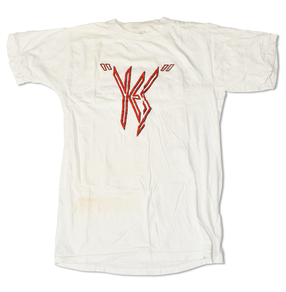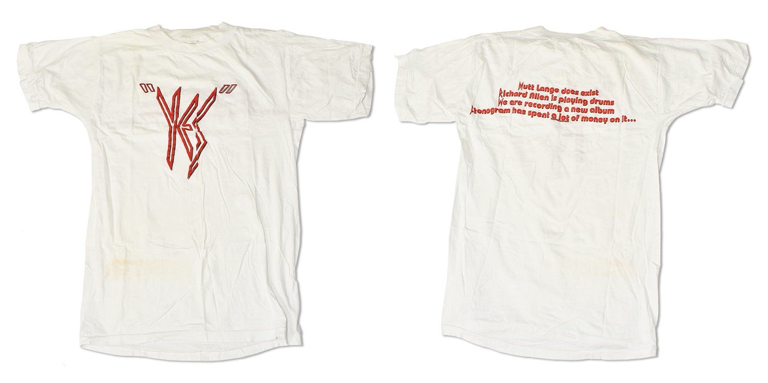 Made sometime in 1986/87, "Yes," confirms the Hysteria album is on its way. The wearer of this shirt would undoubtedly be either one of the Lepps, or someone very close to them since this rarest of rarities, this jewel of a shirt, was designed by Andie Airfix, and printed in the tiniest of batches and kept within the tightest possible circle. For more context, look at the back which reads, "Mutt Lange does exist. Richard Allen is playing drums. We are recording a new album. Phonogram has spent a lot of money on it…" From the collection of Def Leppard.