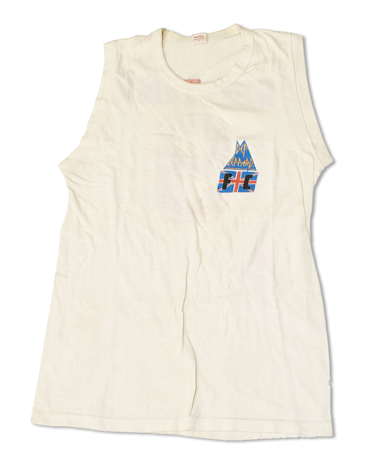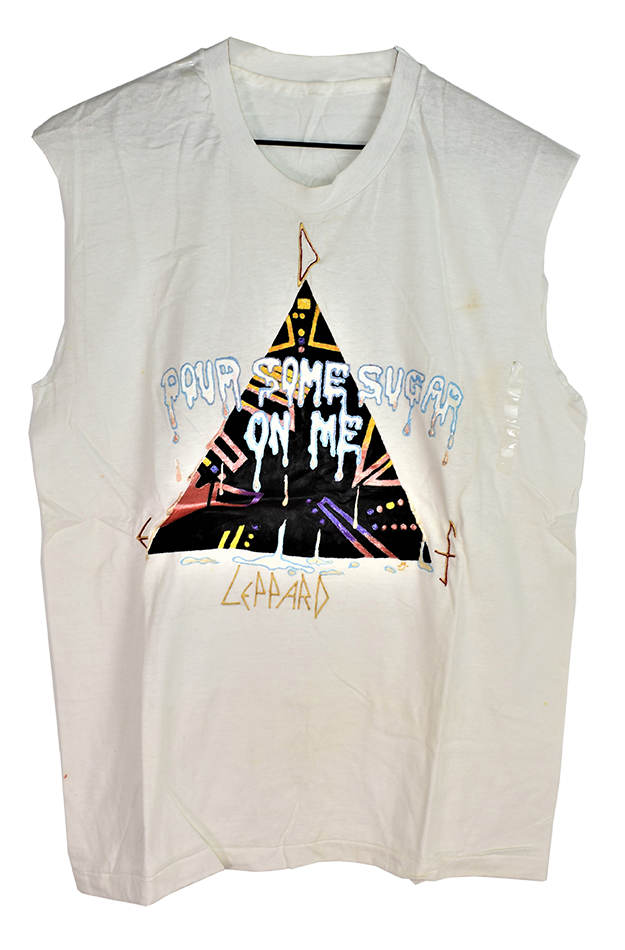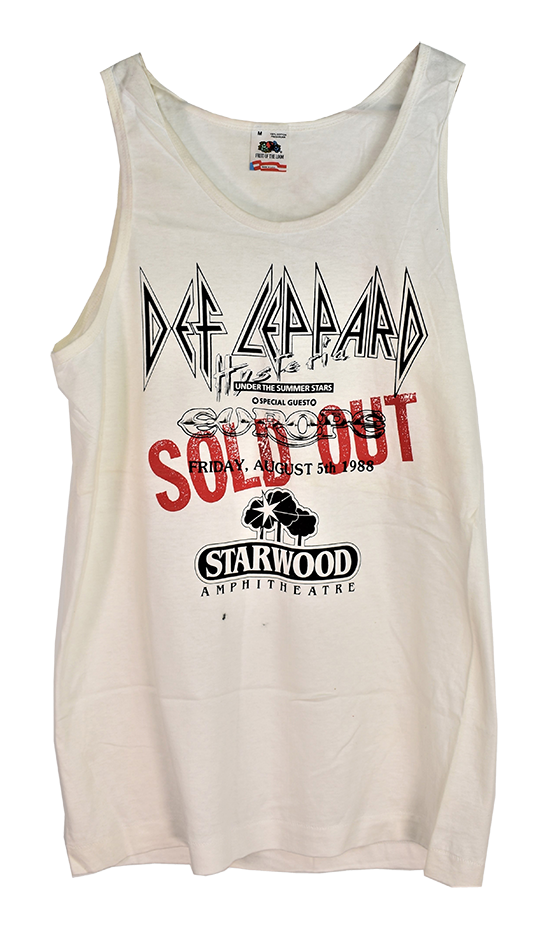 Steve Clark's personal sleeveless t-shirt from the Hysteria tour stop at the Nashville venue, The Starwood Amphitheater, August 1988. Europe were the openers. Lorelei Shellist says: "This was a t-shirt Steve wore when kicking around backstage at the gigs. Most times when they would play soccer together - just to pass the time." Light-weight and clearly comfortable enough for a good backstage game and with signs of wear-in, this tee is a real worldie. Courtesy of the Lorelei Shellist Private Collection.