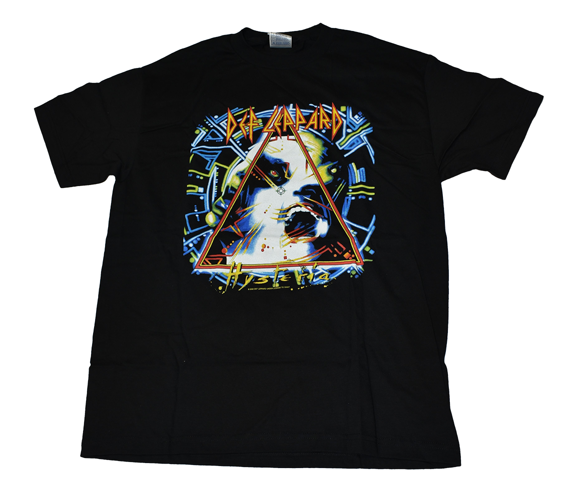 Black short-sleeved t-shirt featuring full color Hysteria screaming head cover artwork. From the collection of Def Leppard.