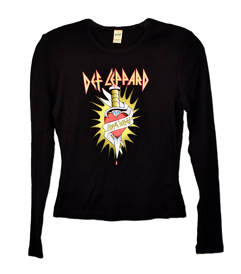 Rare, black long sleeved "Love Bites" fitted t-shirt with tattoo-style dagger-in-the-heart design, and a classic yellow and red Def Leppard logo. "Love Bites" was a huge fan favorite that elicited strong emotions, even from Phil Collen's mom. Phil: "Right, so Love Bites - our only number one single in the States actually. When we demoed this, we first got it, I played to my mum, and she started crying. I was like, well, she's so lovely. I was like, oh wow, okay. If it does that, it does that to the chicks. Yeah. So, that was the thing. We knew it was really special. First off, Mutt came - actually he had pretty much the whole song. And he sounds like Don Henley when he sings. And he brought it in, he played. He was playing like that on acoustic guitar. It was like, wow this is great. What a great song.