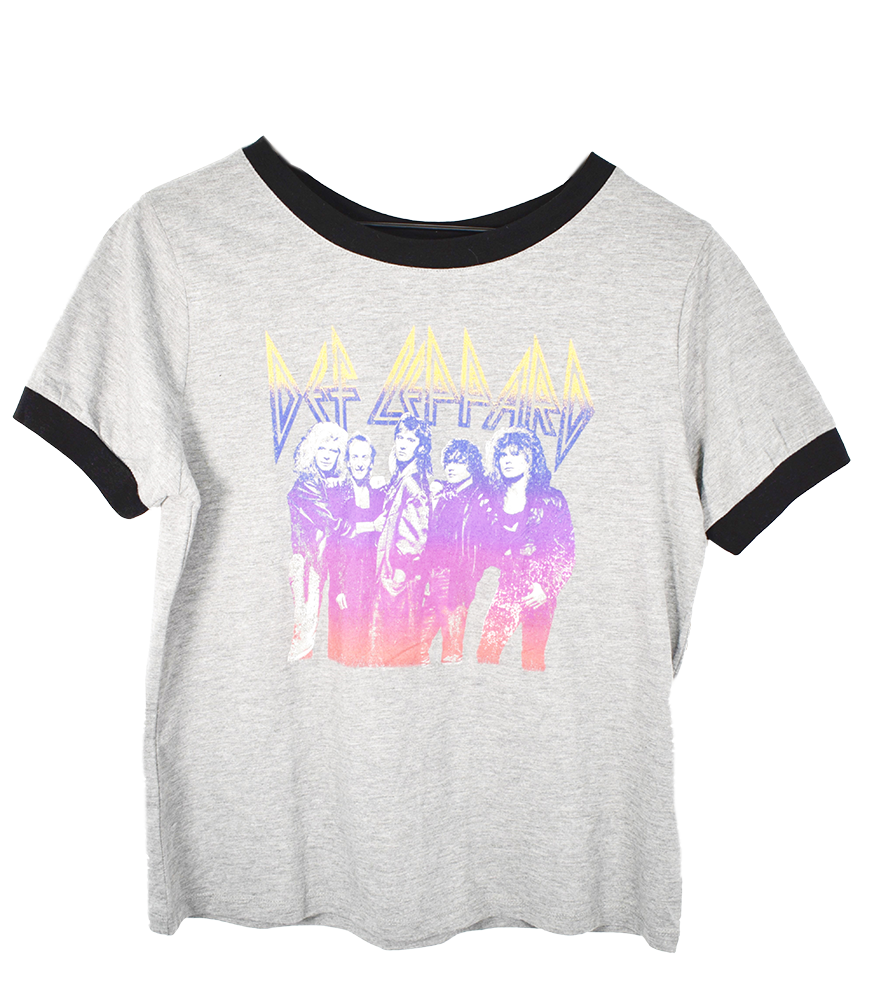 Cool gray tribute t-shirt with black rings and a sunset-colour treatment over a Hysteria-era photo of Steve Clark, Phil Collen, Joe Elliott, Rick Allen, and Rick Savage. From the collection of Def Leppard.