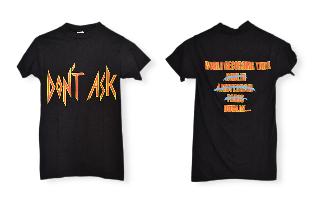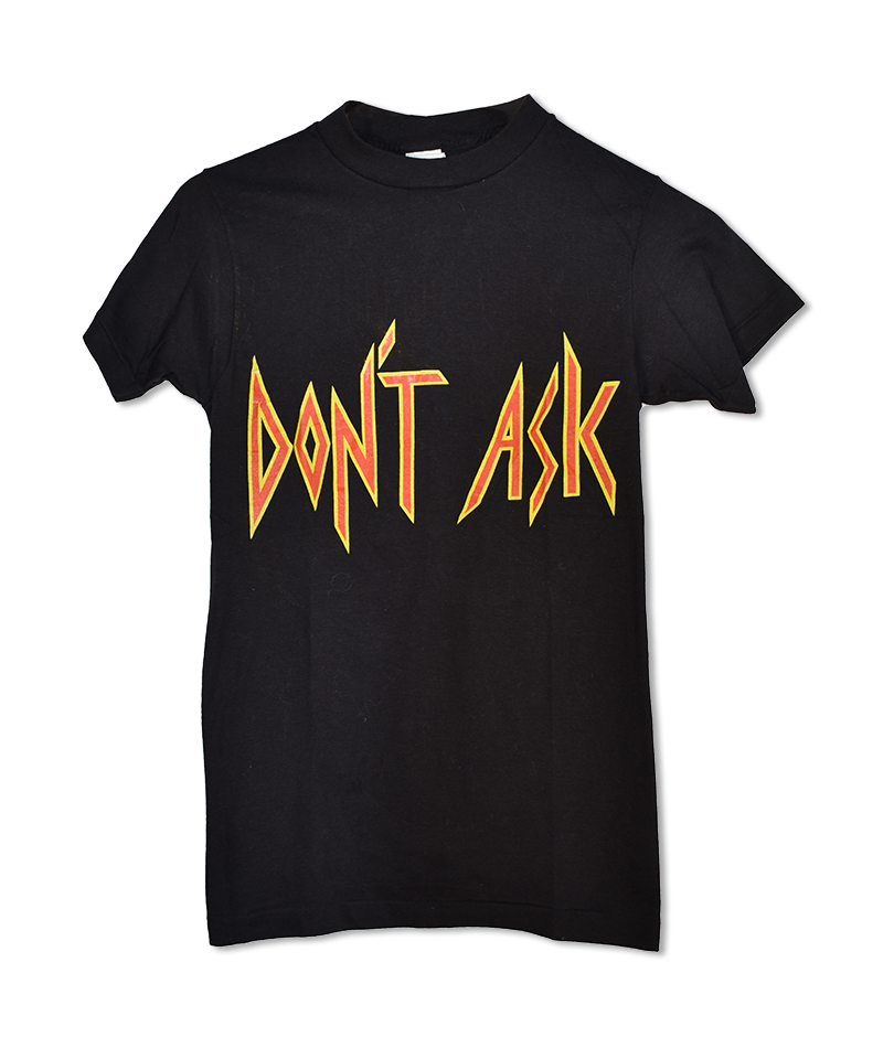 Basically the Unobtanium of all rock t-shirts, this Andie Airfix-designed DON'T ASK tee was made in June/July of 1985. It comes from Steve Clark's own personal collection. So yeah. This is amazing. Don't get too close. Maybe don't even look at it. Pretend we never showed it to you. Courtesy of the Lorelei Shellist Private Collection.