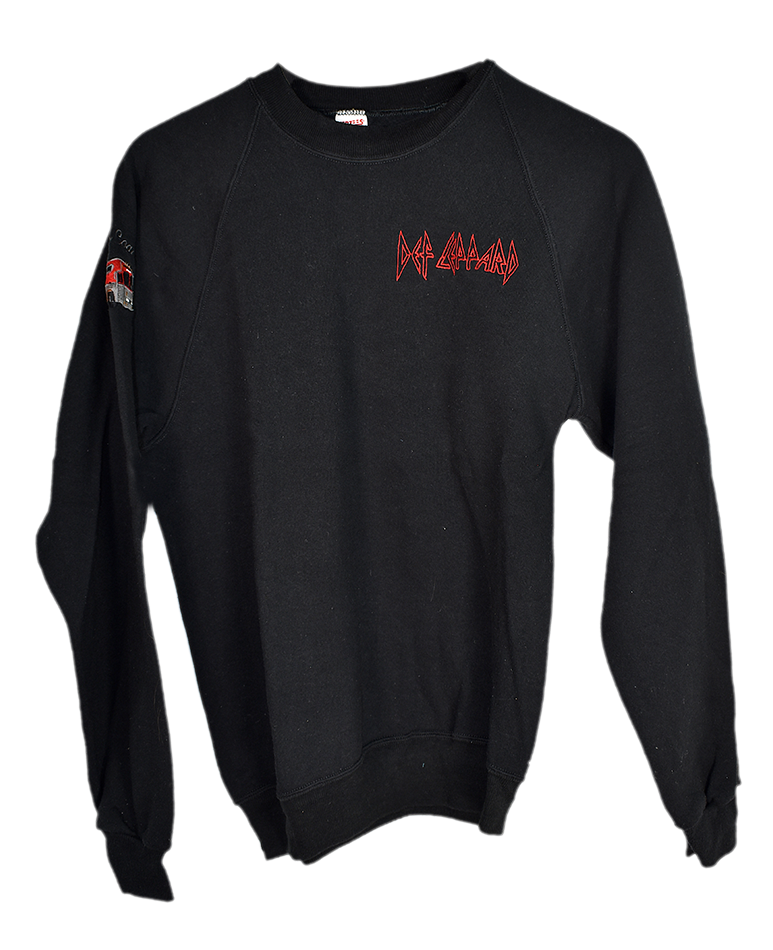 Steve Clark's Jerzees brand black crewneck sweatshirt with red Def Leppard logo embroidered on breast and "Senators Coaches" with bus embroidered on right sleeve. Senators Coaches has been around since 1978, and is one of the oldest rock 'n roll touring bus companies in America. Courtesy of the Lorelei Shellist Private Collection.