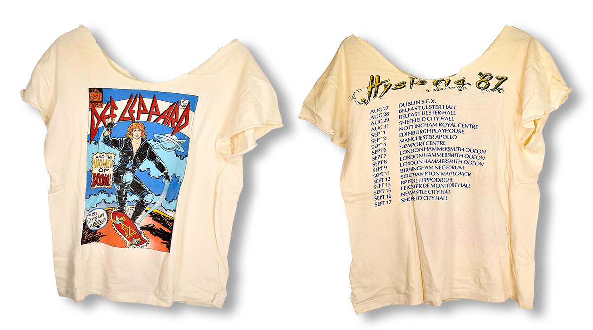 An original Hysteria World Tour tee from the March and April 1988 leg. The band started at Isstadion in beautiful Stockholm on 4th March, and took a small break after King's Hall in Belfast, 22nd April. Color photo of the band and the classic yellow and red Def Leppard logo on the front, tour dates on the back. From the collection of Def Leppard.