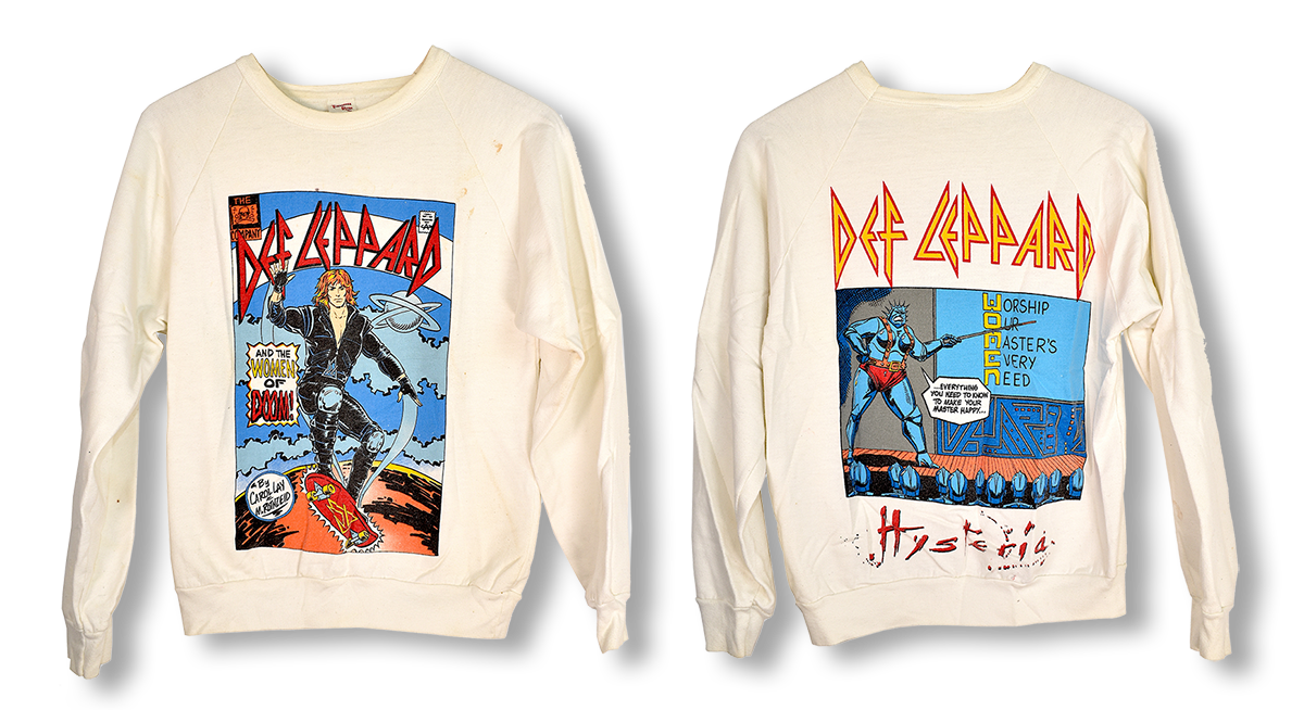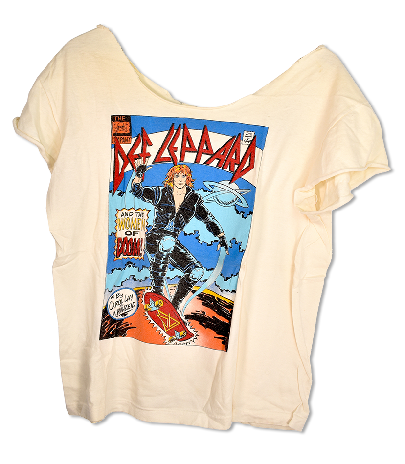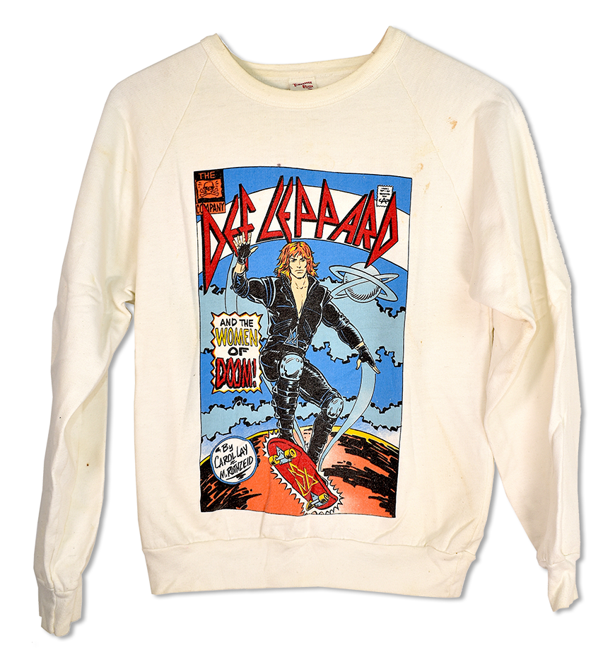 Steve Clark's mega-rare 1987 "Def Leppard and the Women of Doom" sweatshirt, that accompanied the release of the "Women" single from Hysteria. Original comic art by Carol Lay with story contributions by M (Mitzi) Rothzeid. In the video for "Women," the skateboarding protagonist is named Def Leppard, and he travels to a distant planet, battling evil alien overlords to liberate female robots. Bonus note from Carol Lay - she paid homage to Jack Kirby's Silver Surfer in the creation of this Def Leppard comic art. Courtesy of the Lorelei Shellist Private Collection.