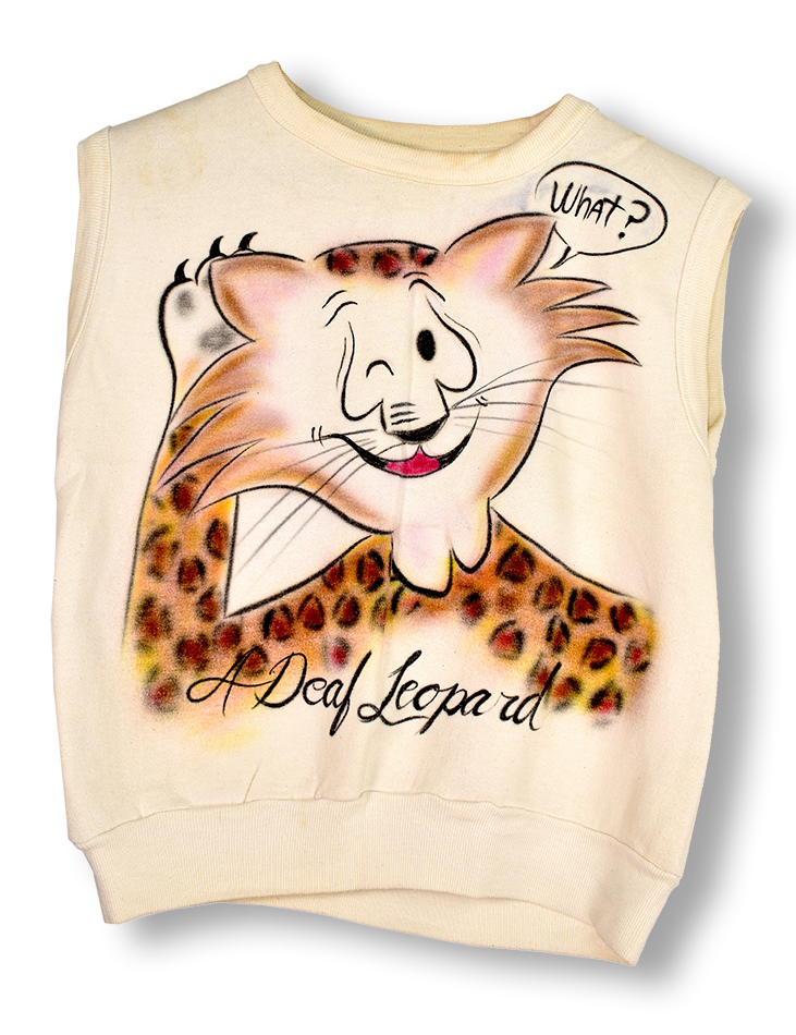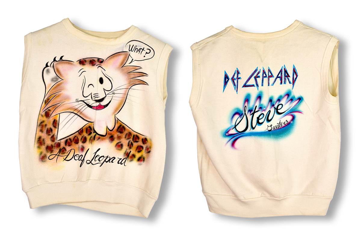 What? A Deaf Leopard Def Leppard personalized shirt, made just for Steve Clark? This fan-made sleeveless shirt was much appreciated by Clark, as he was very moved by these types of fun, artistic, and thoughtful gifts. An air-brushed cartoon leopard on the front, and Steve's name and Def Leppard band logo airbrushed on the back. Courtesy of the Lorelei Shellist Private Collection.