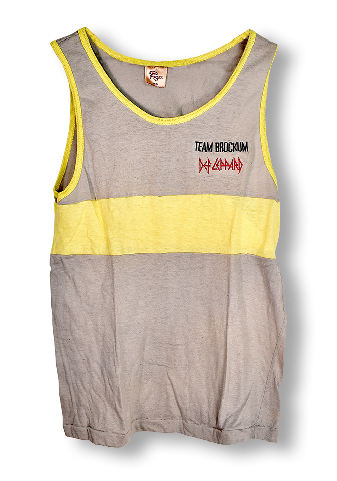 Steve Clark's grey crew tank top with yellow rings and stripe, with Team Brockum and red Def Leppard logo embroidered on the breast. Size medium, and in good condition. Courtesy of the Lorelei Shellist Private Collection.