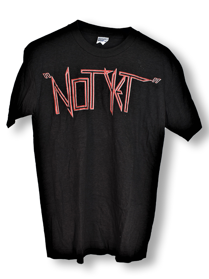 Steve Clark's personal, ultra rare, inner-circle-only, Andie Airfix-designed and made between early-1985 - mid-87. It has the Def Leppard font black t-shirt, printed to answer those pesky and persistent questions about Hysteria's release. The answer was of course, "NOT YET." For emphasis, the back reads, "Listen! If it was finished, you would have heard it!" Rick Savage tells the tale... Sav: It just reminded me of blimey, how long it was taking us to actually make the record. 'Cause we went through so many processes in the process of making Hysteria. And obviously we'd just come off the back of an extremely successful album, with Pyromania. And of course everybody was expecting to hear the follow-up, everybody wanted to know, you know? Because it would just - people were just like, couldn't wait any longer. And the album was dragging on and dragging on to the point where we in the middle of recording the album - this is probably eighteen months to two years in. This is after Rick had his accident. We actually did some European concerts and festivals with Bon Jovi and Ozzy, and that's when I remember the shirts appearing. And I think it was just more from a management point of view, Q Prime. Peter Mensch and Cliff Burnstein. We thought we had to do something because we were just getting so many questions, asking pretty much the same thing as, "When is the album ready?" "Is it finished yet?" You know, "what's it like, when's it coming out," et cetera, et cetera. And it was like, well, we'll just put the answer on a t-shirt and let everybody read the t-shirt." An incredible piece of rock history, as well as an emphatic show of Leppard solidarity. Courtesy of the Lorelei Shellist Private Collection.