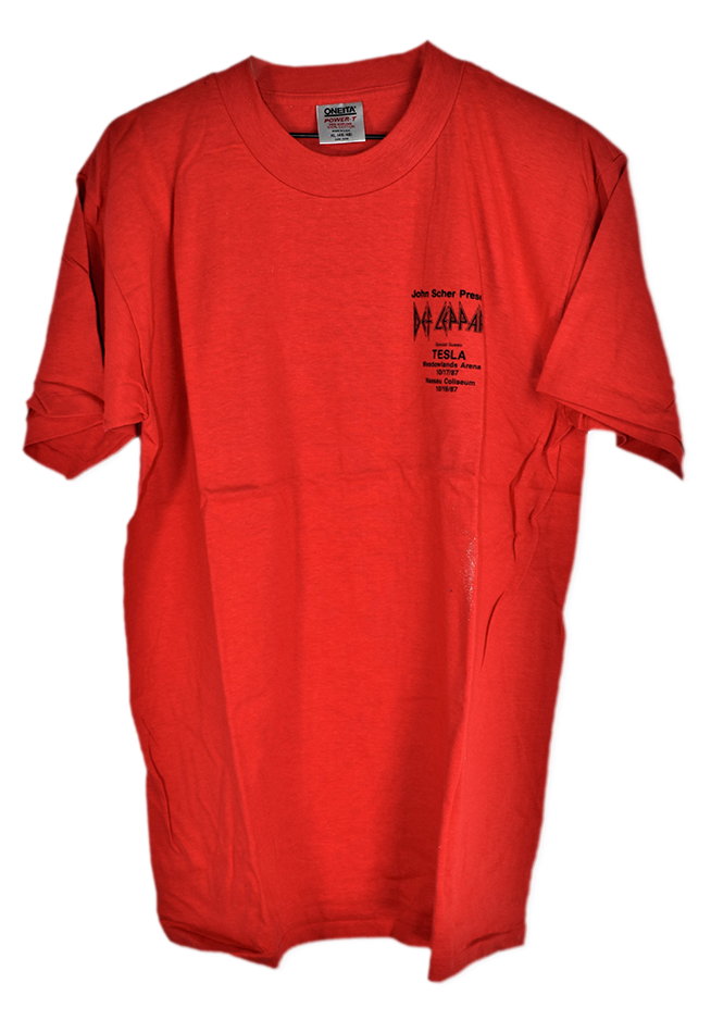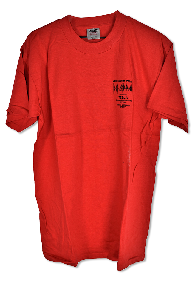 Steve Clark's red t-shirt made for the Hysteria performances at the Brendan Byrne Arena inside the Meadowlands Complex in New Jersey 17th October, 1987, and Nassau Veterans Memorial Coliseum in Long Island, 18th October, 1987. Gifted by the promoter. Special opening act was Tesla. Courtesy of the Lorelei Shellist Private Collection.