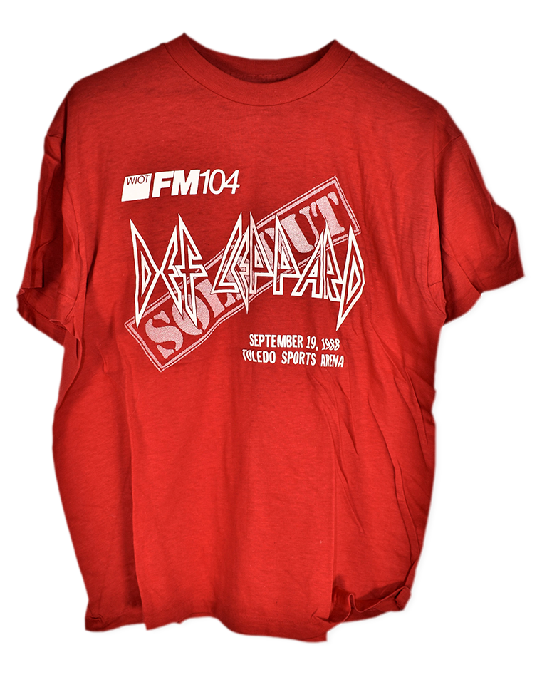 Steve Clark's red WIOT FM104 shirt from the Hysteria Tour show at the Toledo Sports Arena, 19th September, 1988. This Toledo, Ohio stop was not originally planned, until a successful petition campaign started by local radio station WIOT-FM lured the band in. Obviously by the proud declaration of this vintage tee, the show sold out. Well done, WIOT 104. Courtesy of the Lorelei Shellist Private Collection.
