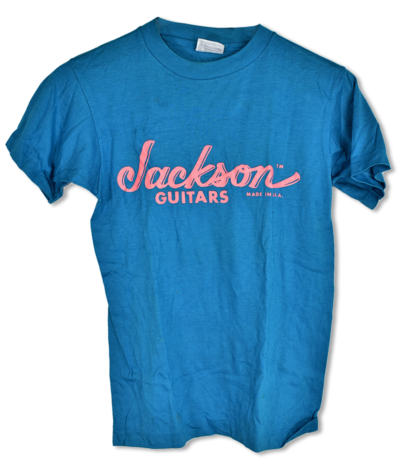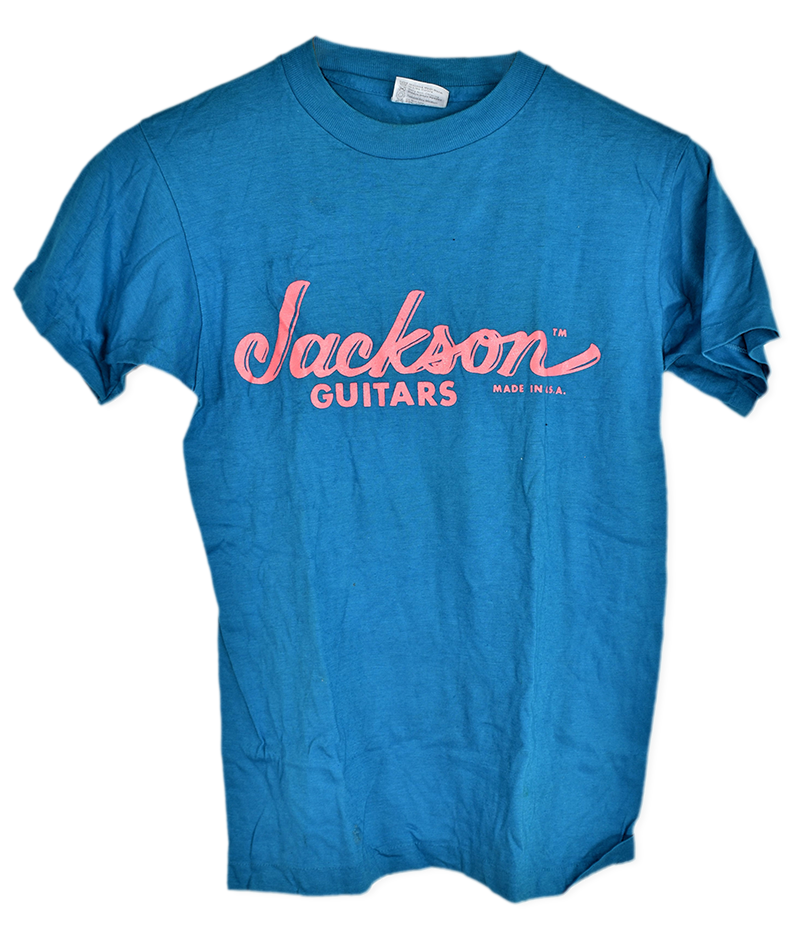 Steve Clark's own blue Jackson Guitars t-shirt. The Jackson logo in pink is screened on the front and back. Worn, and in good condition. Courtesy of the Lorelei Shellist Private Collection.