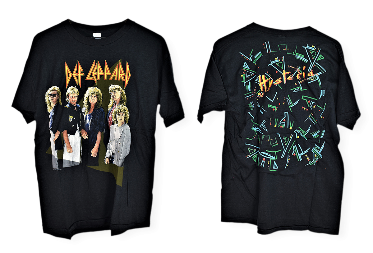 Steve Clark's Hysteria tee with band photo on the front. Large Hysteria logo with blue and green design on the back. In good condition. Courtesy of the Lorelei Shellist Private Collection.