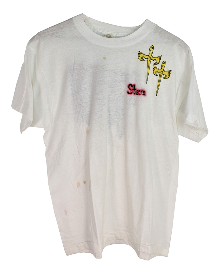 “One of Steve's favorite t-shirts. He wore it all the time," says Lorelei Shellist. Steve's beloved teal sleeveless shirt reads "Randy McElrath presents Def Leppard Star Date." Well-loved apparel, but still in good condition. Courtesy of the Lorelei Shellist Private Collection.