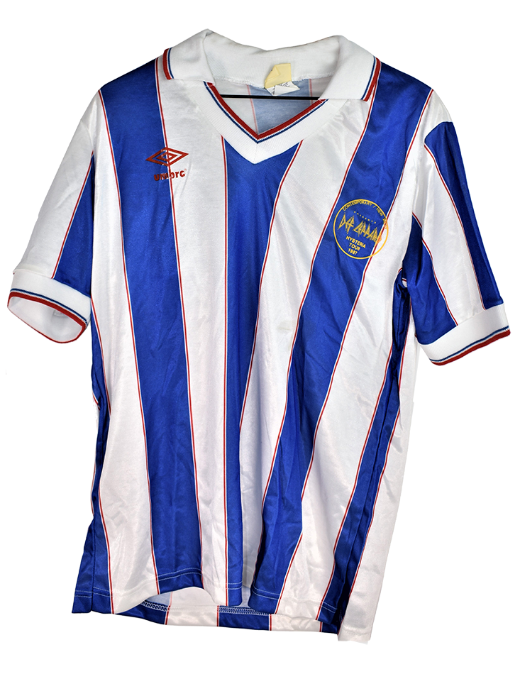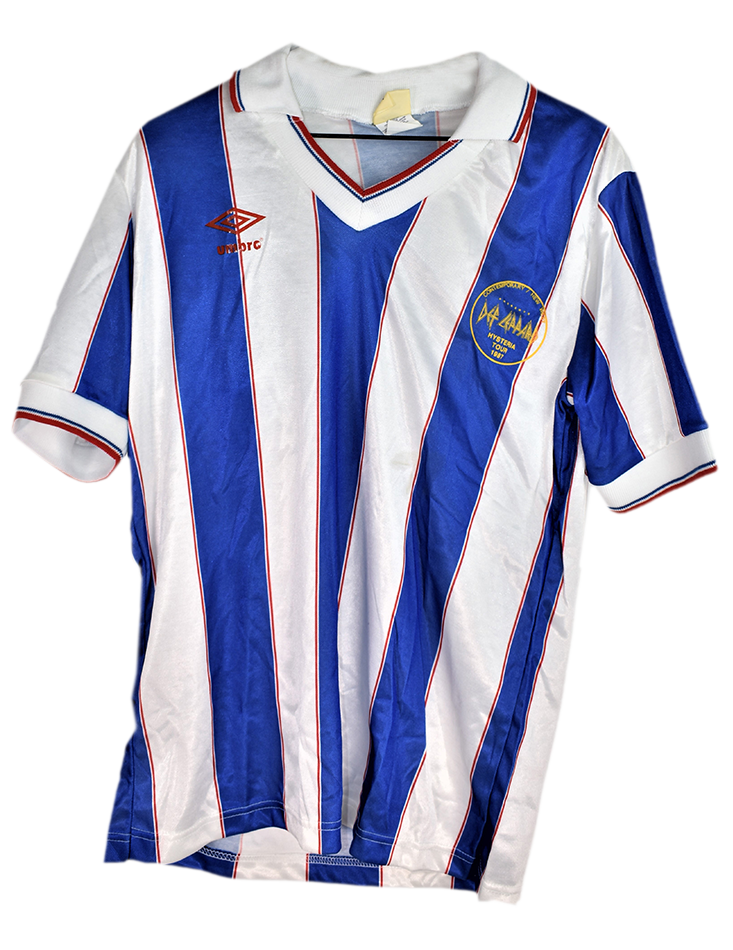 Steve Clark's personal Hysteria tour football shirt, 1987. Based on Sav's favorite football team, the Sheffield Wednesdays, this collared blue and white striped shirt with red accents reads "Def Leppard Hysteria Tour 1987" on the right breast, and clearly reflects the band's love of soccer. Umbro logo in red on the left breast. We're team Leppard all the way. Courtesy of the Lorelei Shellist Private Collection.