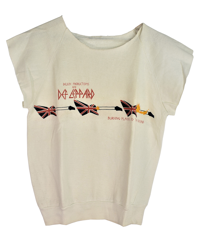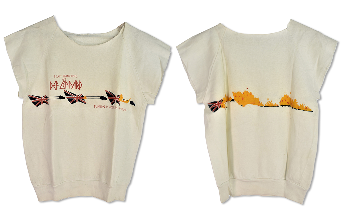 Steve Clark's personal mega-rare and oft-worn white 1983 tee with sleeves and neck slashed by the man himself. This "Belkin Productions and Def Leppard Burning Places to the Ground" Pyromania Tour t-shirt features Union Jack guitars circling the chest from front to back, each guitar consecutively more engulfed in flame. How much more on fire could that last guitar be? The answer is none. None more on fire. An incredible find. Courtesy of the Lorelei Shellist Private Collection.