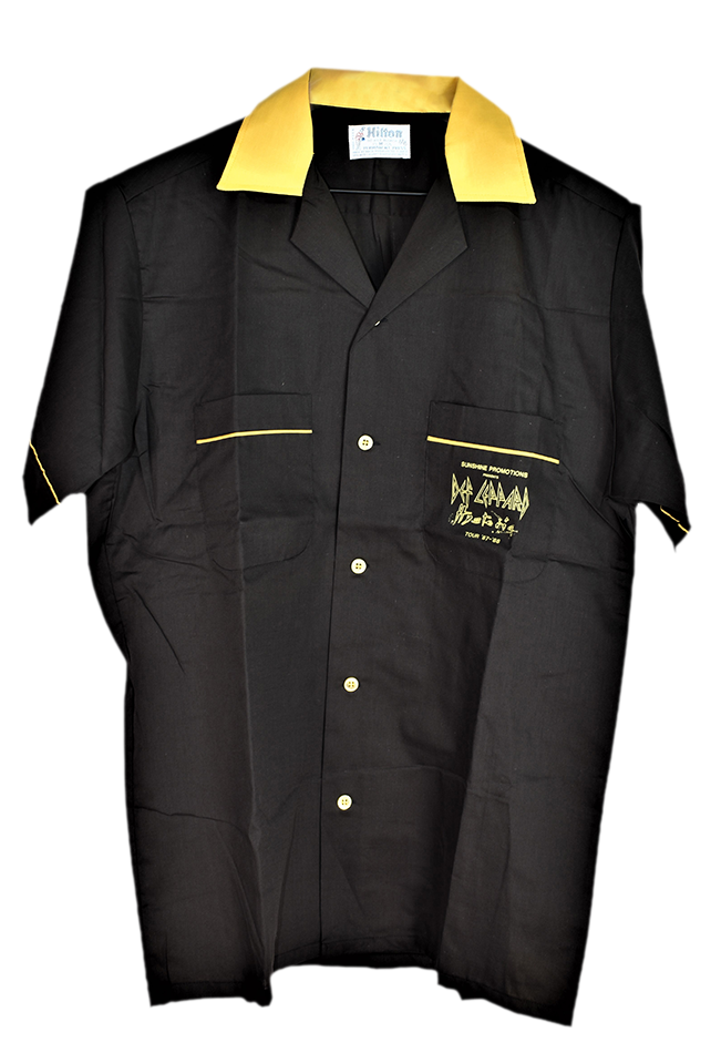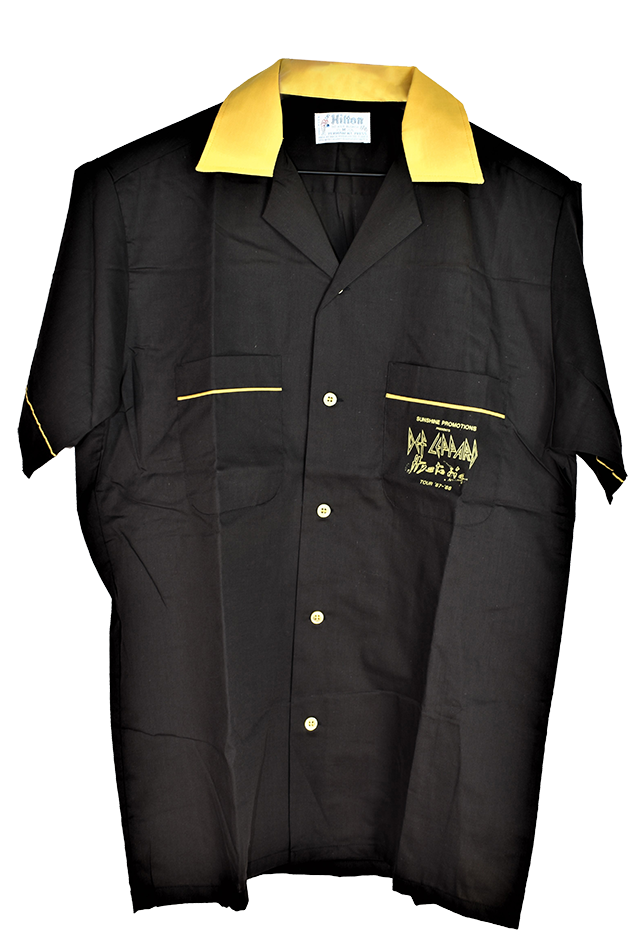 Steve Clark's black bowling shirt with yellow accents, buttons, collar, and yellow "Sunshine promotions presents Def Leppard Hysteria Tour '87-'88" embroidered on the front pocket. The shirt reminds one of Leppard bowling nights in Dublin during the recording of Hysteria. Courtesy of the Lorelei Shellist Private Collection.