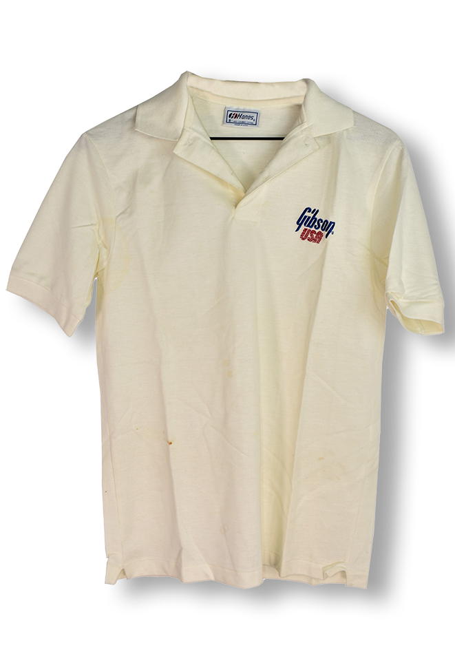 Steve Clark's off-white polo shirt with Gibson USA logo. Steve was rather famously a Gibson fanatic, and established an endorsement relationship with them just before the Hysteria tour. Courtesy of the Lorelei Shellist Private Collection.