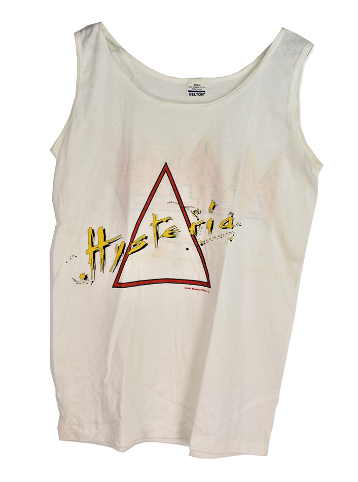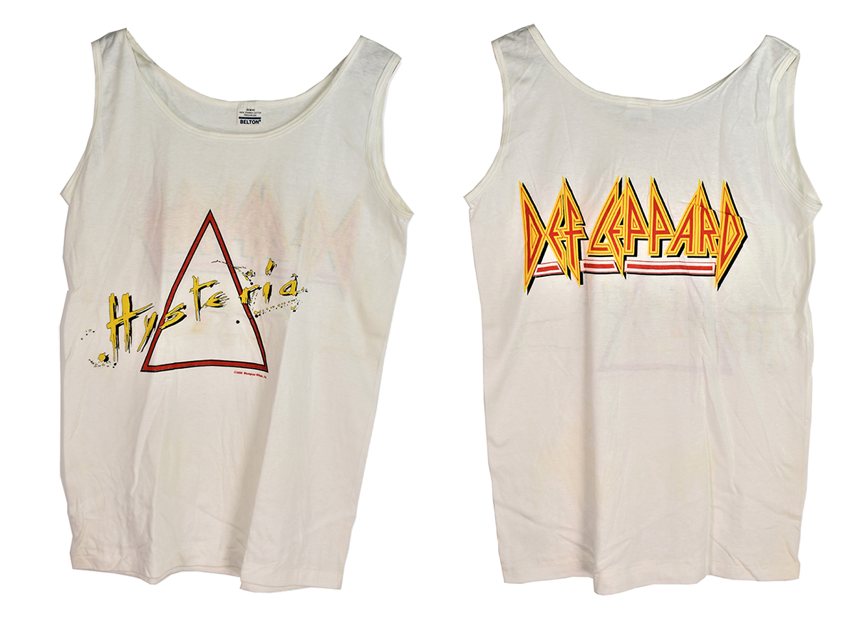Steve Clark's white tank top with a red triangle and Hysteria in yellow on the front, and the red and yellow band logo on the back. The shirt was worn and has some discoloration but is in good condition. Courtesy of the Lorelei Shellist Private Collection.