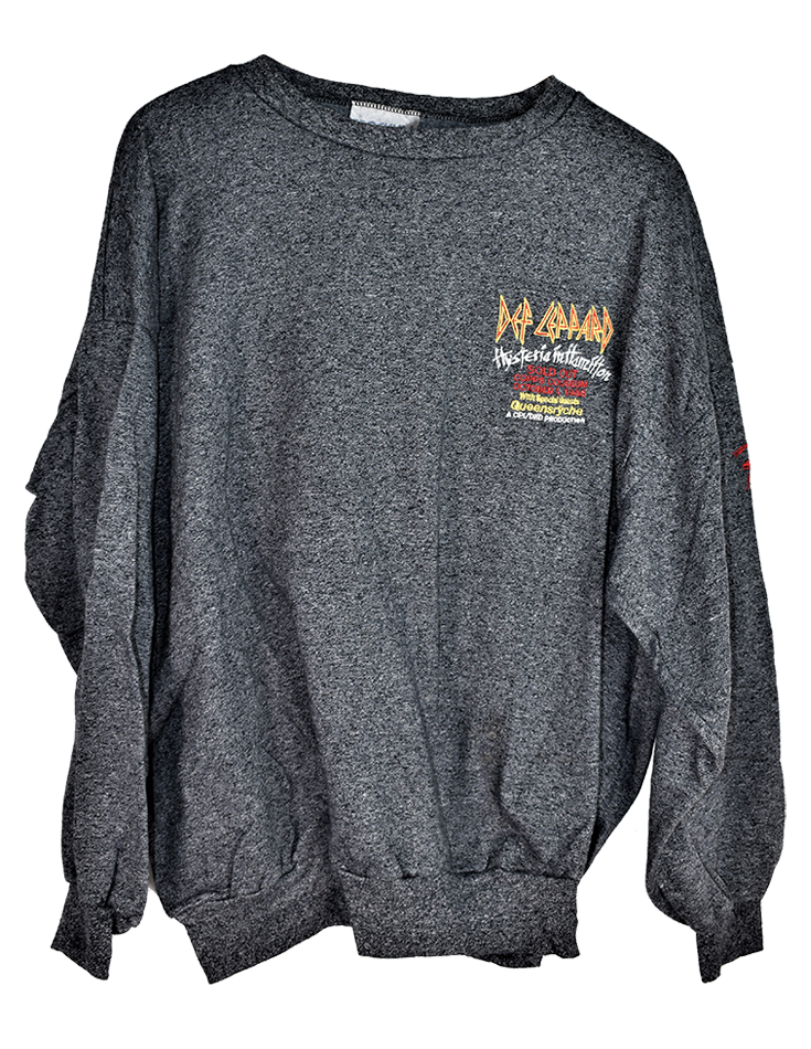 Steve Clark's grey Hysteria sweatshirt with the "Hysteria" logo design and "World Tour 1988" underneath on the left side of chest. In good condition. Courtesy of the Lorelei Shellist Private Collection.