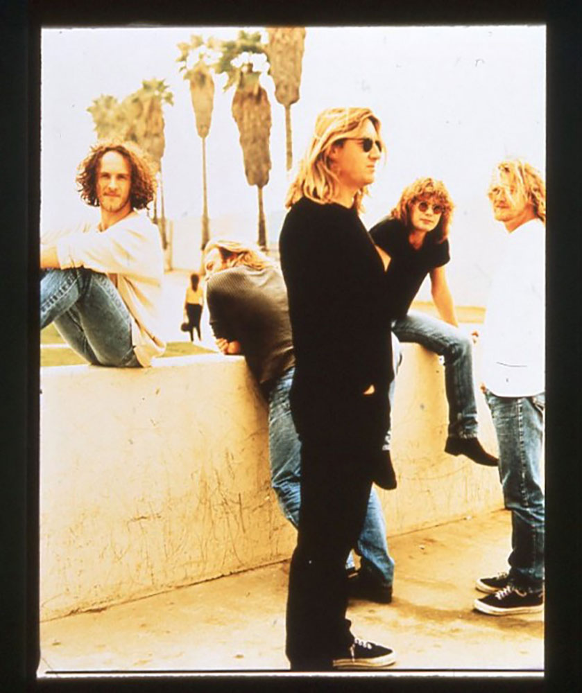 Viv and the band relax beachside in this Slang promotional portrait taken in Los Angeles, circa 1996. Photo: Kevin Westenberg. From the Collection of Def Leppard.