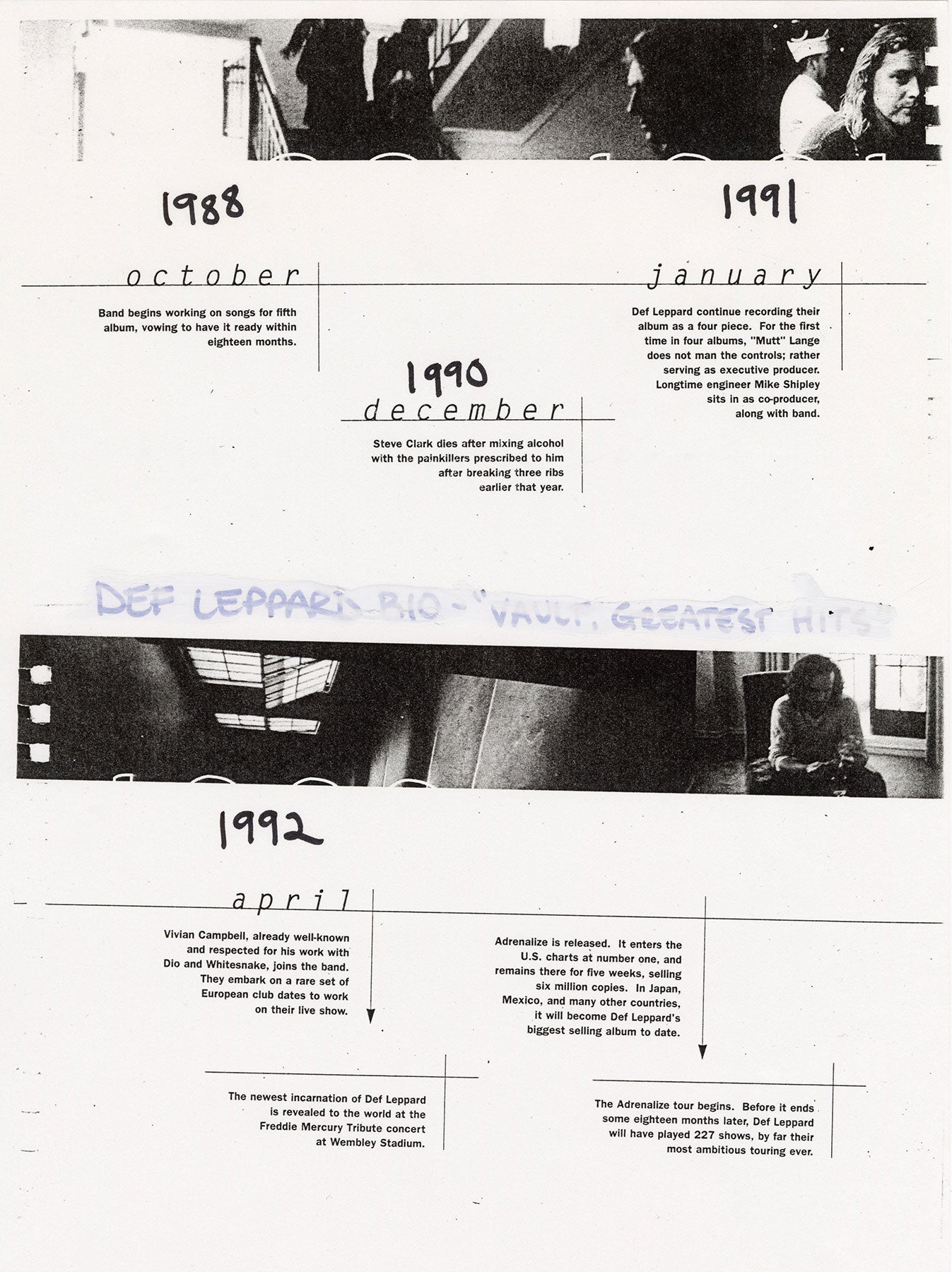 Art mock-up from Vault: Def Leppard Greatest Hits (1980-1995) that spotlights Viv joining the band in 1992. From the Collection of Def Leppard.