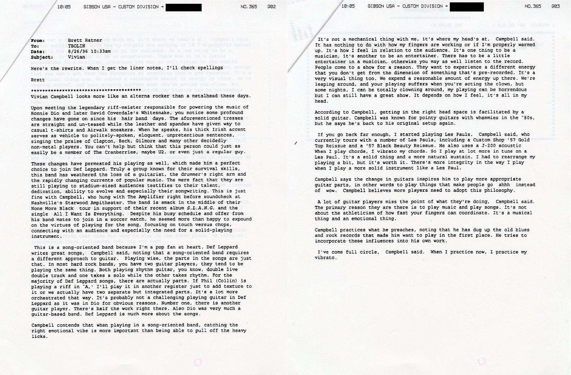 Faxed correspondence from 26 August 1996 of a freshly re-written spotlight on Viv for Gibson USA. The article draft covers Viv's love of Les Pauls and the importance of playing emotionally. From the Collection of Def Leppard.